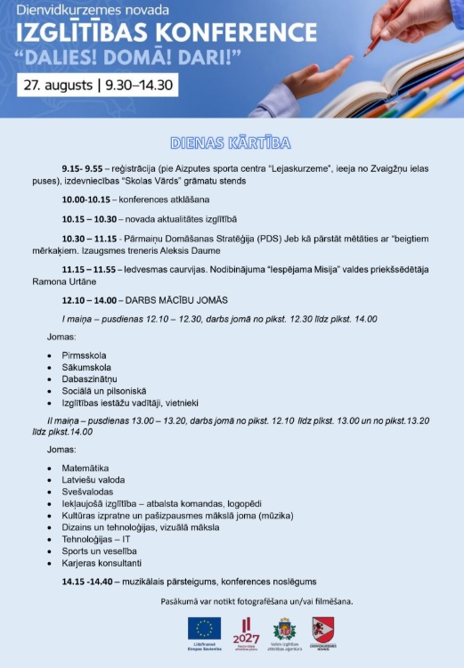 Trešdien, 27. augustā no pulksten 9.30 līdz 15 Aizputes vidusskolā tiksies Dienvidkurzemes novada izglītības darbinieki konferencē “Dalies, domā, dari”.
