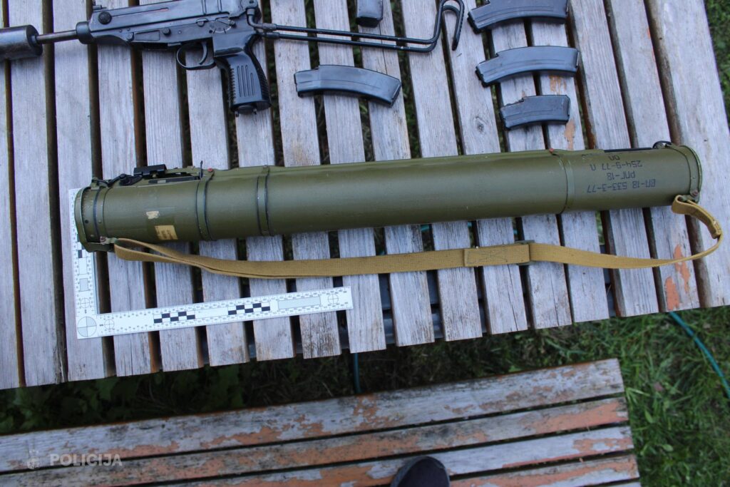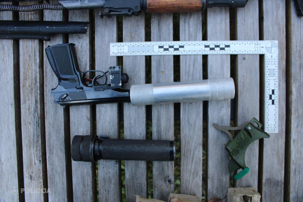 FOTO: Vīrietis vairākos slēpņos glabājis mašīnpistoles, pistoles ar klusinātājiem un prettanku ieroci