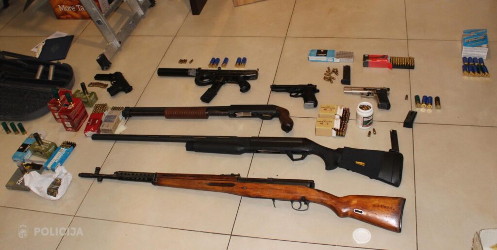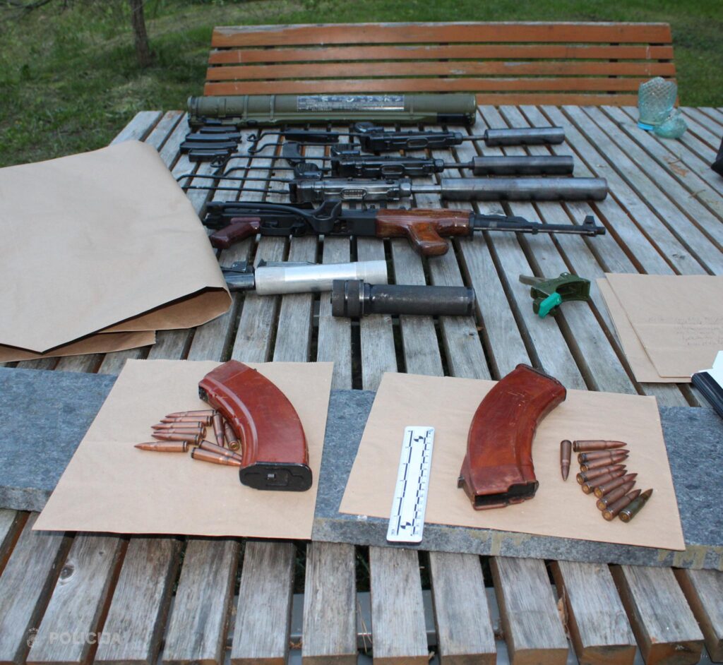 “Kalašnikova” tipa triecienšautene, trīs pistoles, tajā skaitā ar klusinātājiem, vairākas pusautomātiskās karabīnes, bises un pumpja bises, kā arī vienreizējās lietošanas bezatgrūdes prettanku raķešu palaidējs “RPG-18”. Tāpat dažādu kalibru munīcija – kopā 632 patronas.