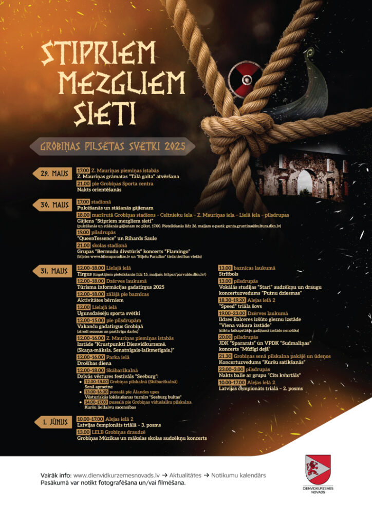 No 29. maija līdz 1. jūnijam Grobiņa aicina uz pilsētas svētkiem ar zīmīgu svētku vadmotīvu: “Stipriem mezgliem sieti”. Tas simbolizē Grobiņas spēku – vienotību, kas savijusi kopā tās ļaudis, notikumus un leģendas vairāk nekā trīs gadsimtu garumā, portālu “ReKurZeme” informē Dienvidkurzemes novada pašvaldības sabiedrisko attiecību speciāliste Ilze Elbere.