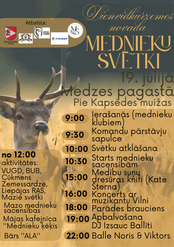 Atzīmējot mednieku kluba “Medze” simtgadi, 19. jūlijā Medzes pagastā norisināsies vērienīgi svētki, aizsākot jaunu tradīciju – Dienvidkurzemes novada mednieku svētkus. Pasākums pulcēs medniekus un interesentus no visa novada, lai godinātu medību kultūru, stiprinātu kopienu un veicinātu savstarpēju sadarbību.