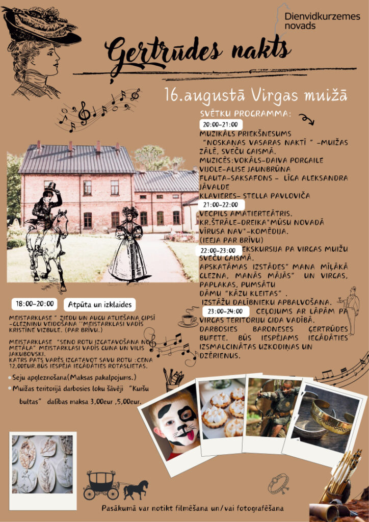 Sestdien, 16. augustā, no pulksten 18 Virgas muiža aicina piedzīvot romantisku un noslēpumainu “Ģertrūdes nakti”, portālu “ReKurZeme” informē Dienvidkurzemes novada pašvaldības sabiedrisko attiecību speciāliste Ilze Elbere.