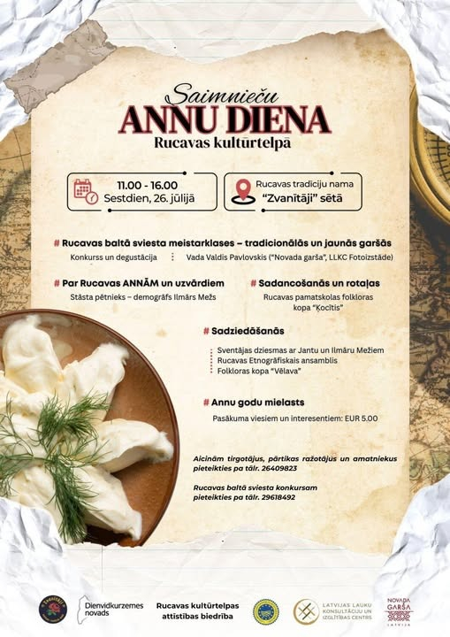 Sestdien, 26. jūlijā, no pulksten 11 Rucavas tradīciju nama “Zvanītāji” sētā norisināsies tradicionālie Annu dienas jeb Saimnieču svētki. Svētku īpašais notikums – saimnieču konkursu “Rucavas baltais sviests toreiz un tagad – atklājam jaunas garšas”, godā ceļot Rucavas balto sviestu kopā ar “Novada garša Latvija”.