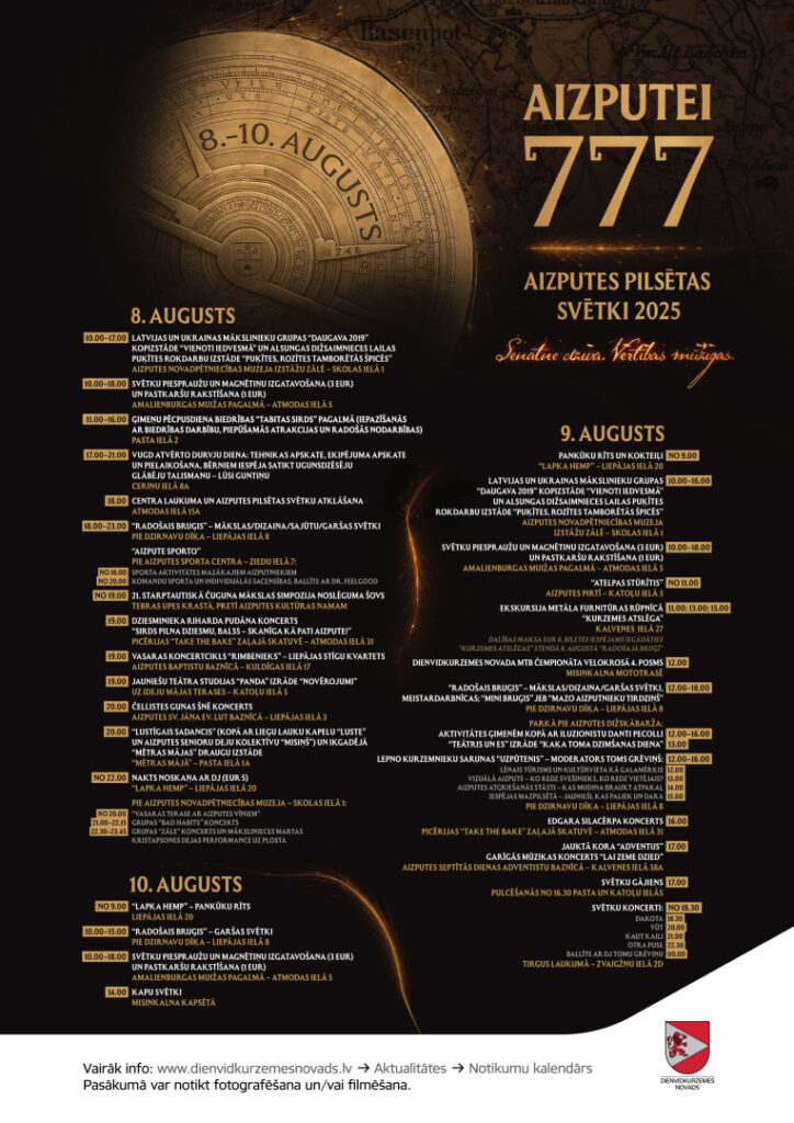 No 8. augusta līdz 10. augustam ar vadmotīvu “Senatne dzīva. Vērtības mūžīgas” svinēs Aizputes 777.jubileju, aģentūru LETA informēja Dienvidkurzemes novada pašvaldības sabiedrisko attiecību speciāliste Ilze Elbere.