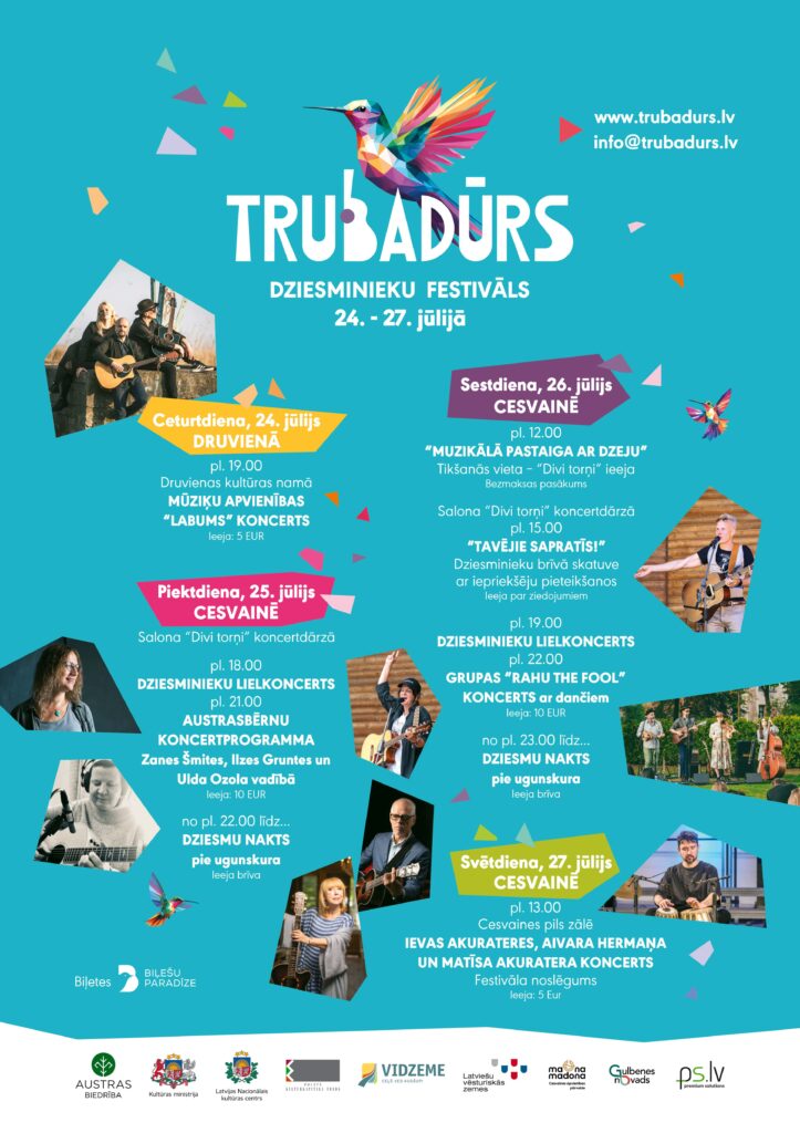 No šodienas līdz 27.jūlijam “Trubadūrs” norisināsies Druvienā un Cesvainē, aicinot gan uz dziesminieku lielkoncertiem, gan autorkoncertiem un muzikālu pastaigu ar dzeju, gan uz dančiem ar grupu “Rahu”, gan uz sadziedāšanos pie ugunskura līdz rīta gaismai.
