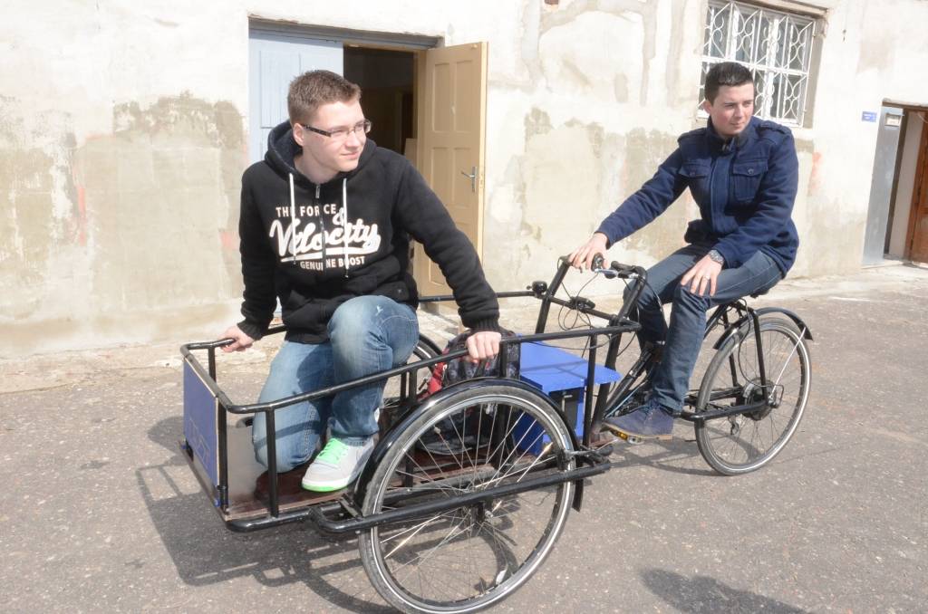 Notika jauna, unikāla braucamrīka testa brauciens. Braucamrīks izgatavots tehnikuma audzēkņu prakses laikā Vācijā. Kā pastāstīja divi no tā veidotājiem, kopumā pie tā strādājuši 34 audzēkņi. “Tas ir kravas velosipēds, kuru var darbināt ar elektromotoru,” stāsta Rihards. Minoties, elektrība tam piedod lielāku ātrumu. Tā veidošanā piedalījušies 3. un 4. kursa audzēkņi, kuri apgūst mehatroniku, elektriķa arodu un arī automehāniķi. Lai izgatavotu šādu braucamo, bija atvēlēts četru nedēļu prakses laiks, bet to prakstiski izdevies uztaisīt divās nedēļās, pēc tam atlikuši vien krāsošanas un elektriskie darbi.