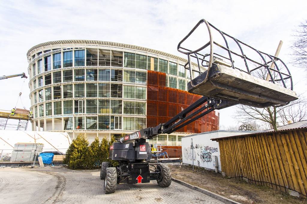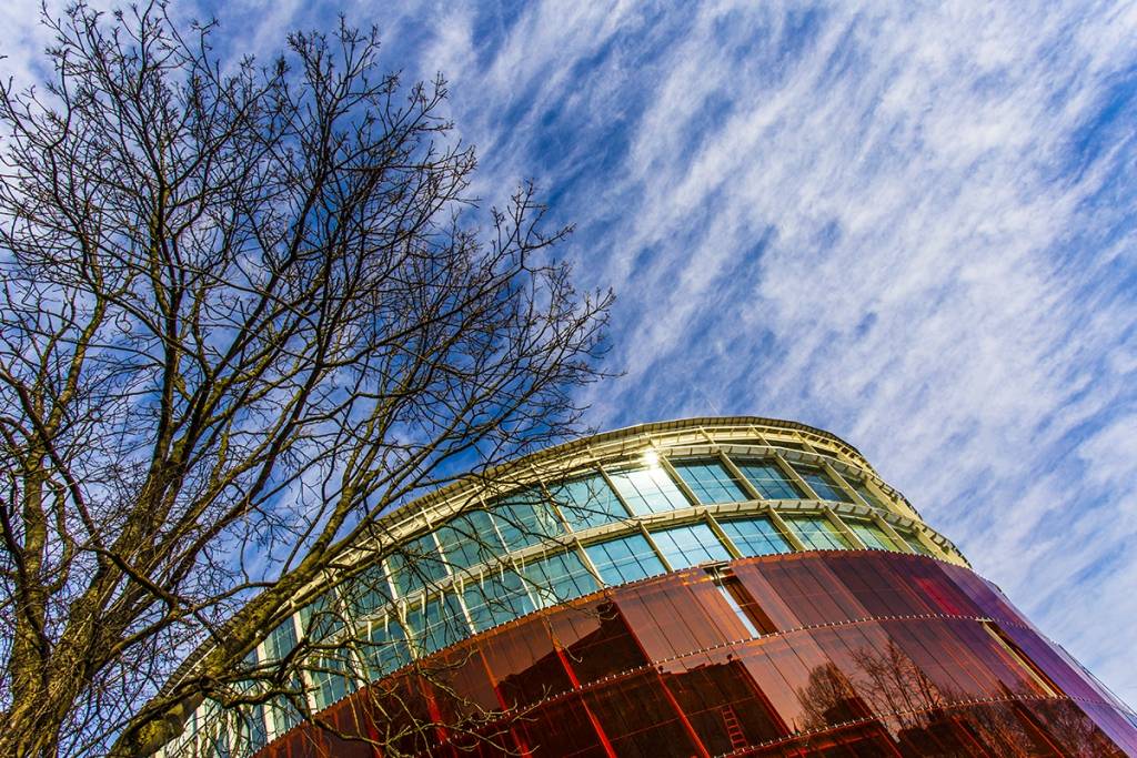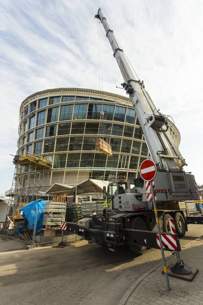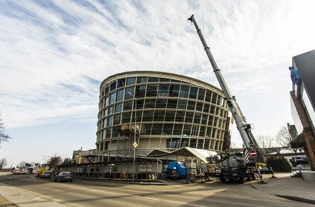 Liepājas koncertzāle “Lielais dzintars” iegūst arvien reālākas dizaina aprises. Ēkas fasādē šobrīd tiek monēts oranžais stiklojums, kas ir viens no galvenajiem koncertzāles dizaina risinājumiem.
