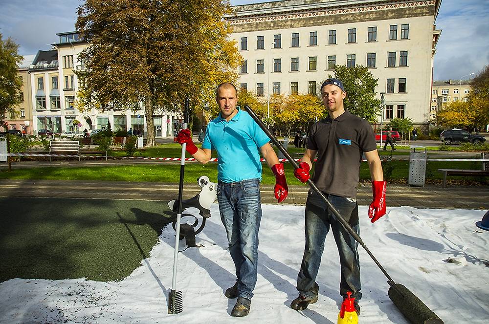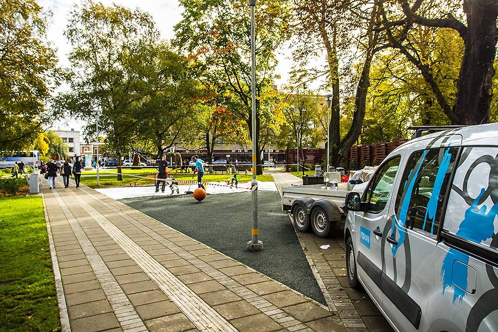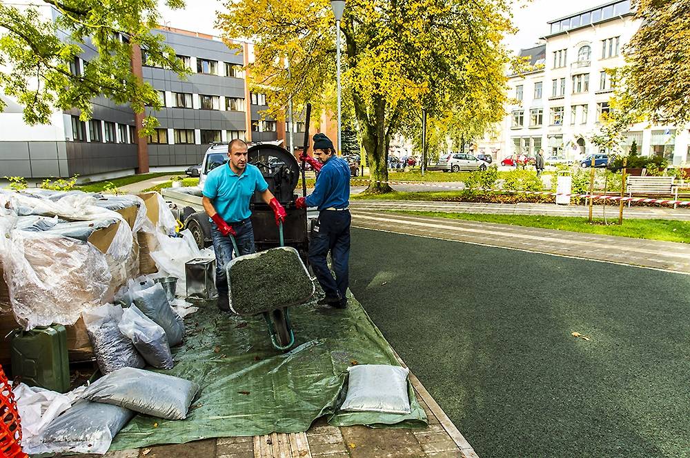 Kurzemes skvēra bērnu laukumā Liepājā pirmdien ieklāj jaunu gumijas segumu.