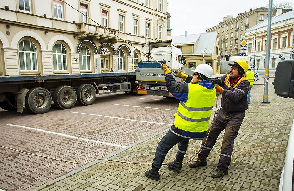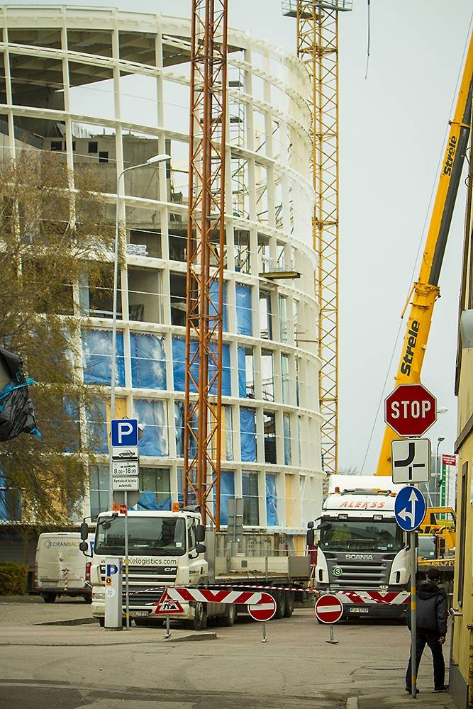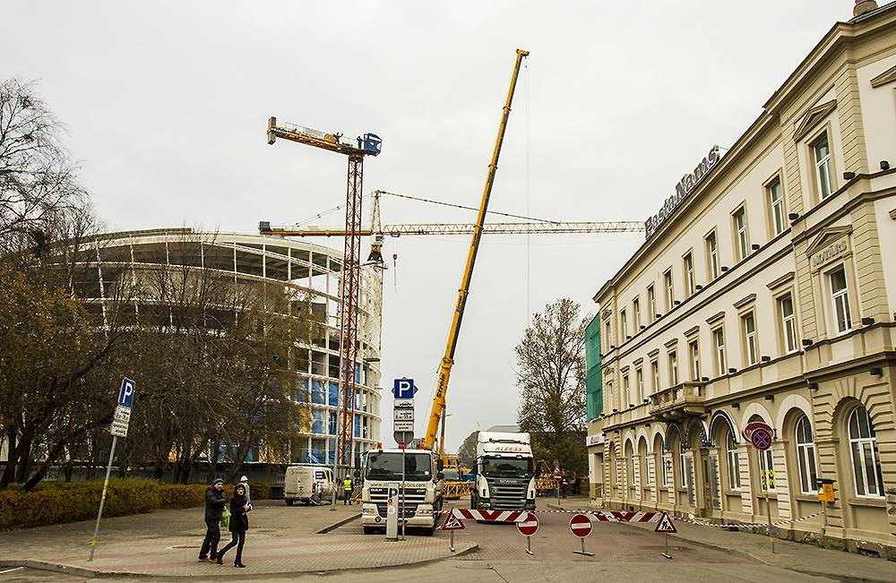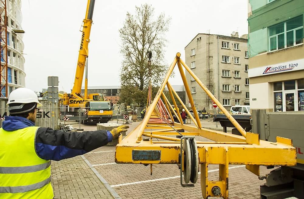 Liepājā topošās koncertzāles “Lielais dzintars” būvlaukumā pirmdien demontē pirmo ceļamkrānu, jo noslēgušies daļa veicamo darbu.