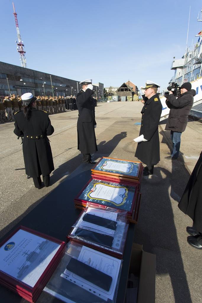 Par godu atjaunotās Jūras spēku flotiles 23.gadadienai, Liepājā piektdien notika svinīgs pasākums, kurā vairākiem karavīriem un civilajiem darbiniekiem tās komandieris jūras kapteinis Juris Roze pasniedza apbalvojumus, informē Krasta apsardzes dienests.