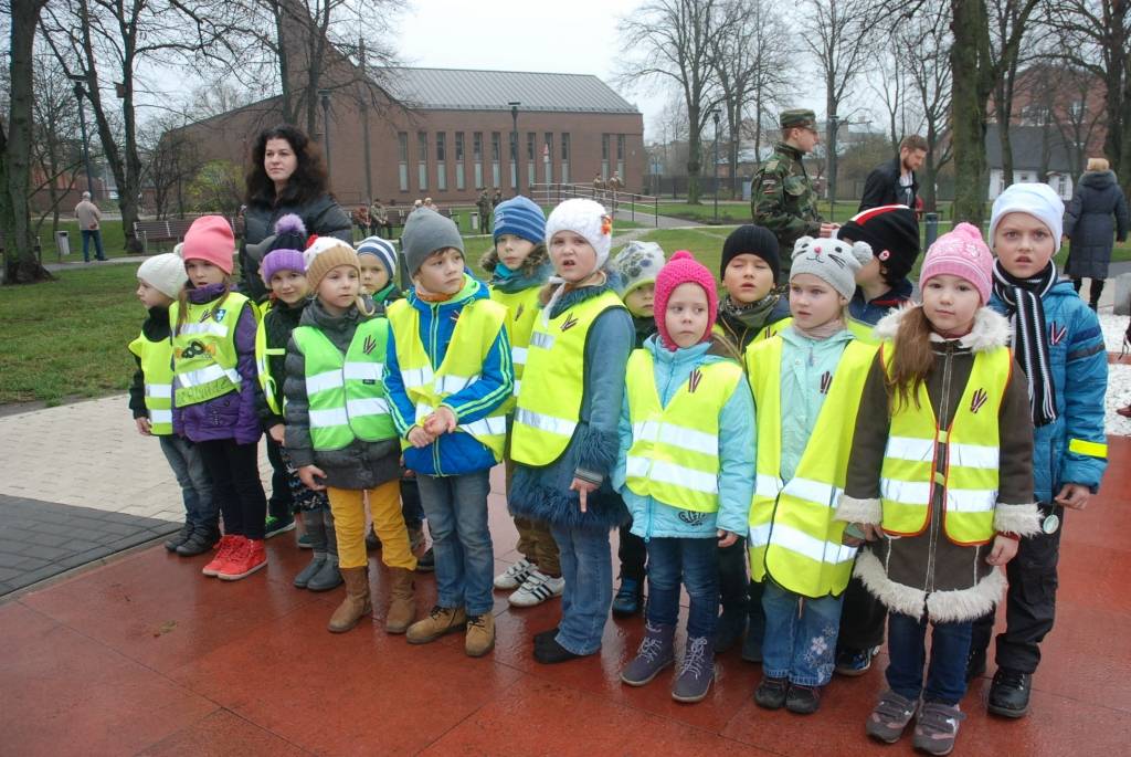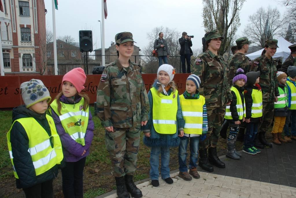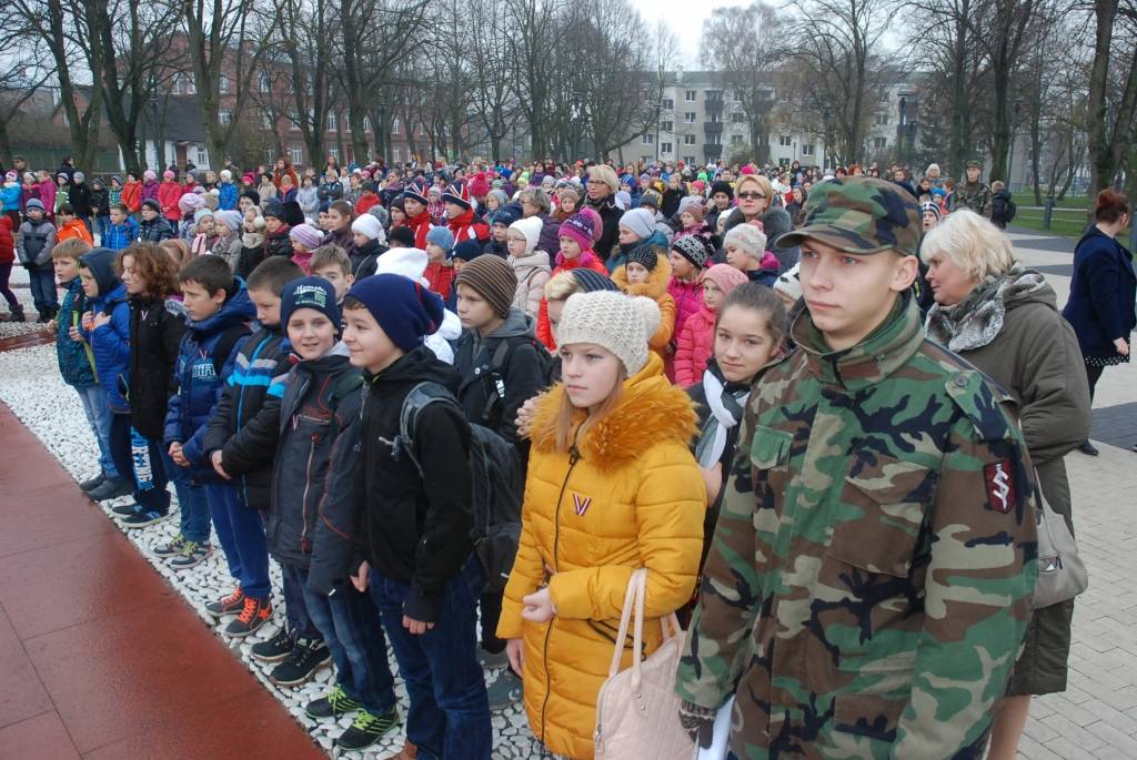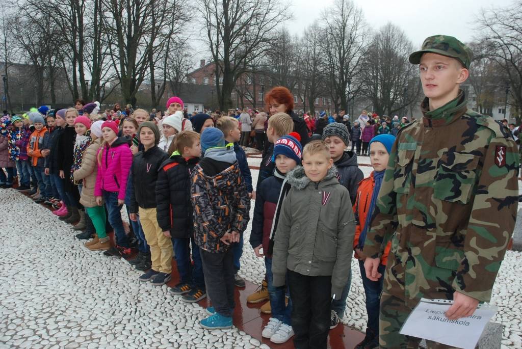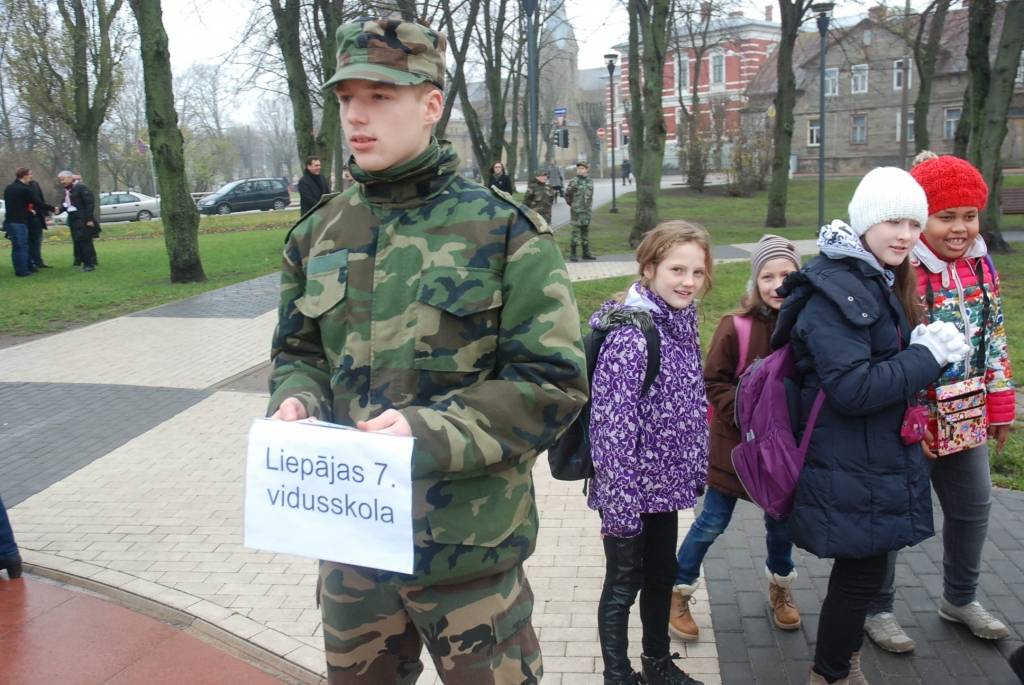 Lāčplēša dienā J.Čakstes laukumā Liepājā uz svinīgu akciju “Mēs par Latviju!” šodien pulcējās skolēni, kur viņiem stāstīja par Brīvības cīņu nozīmi Latvijas vēsturē. Liepājas Jaunsargu vienība demonstrēja arī ierindas mācību.