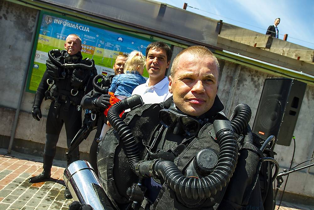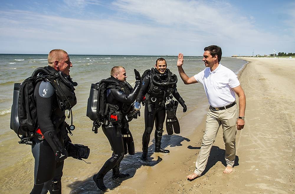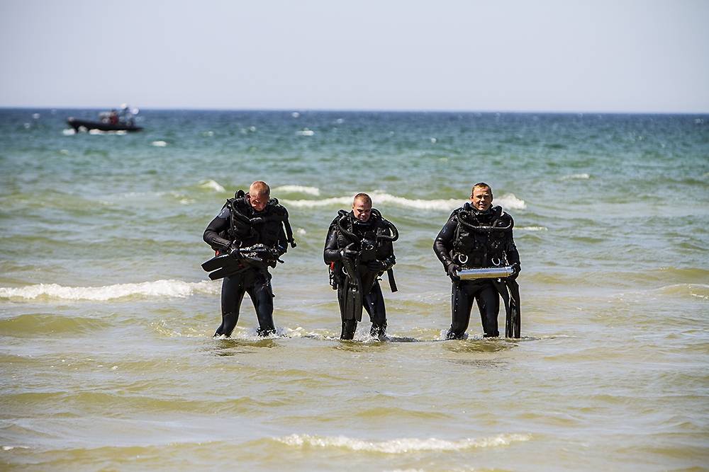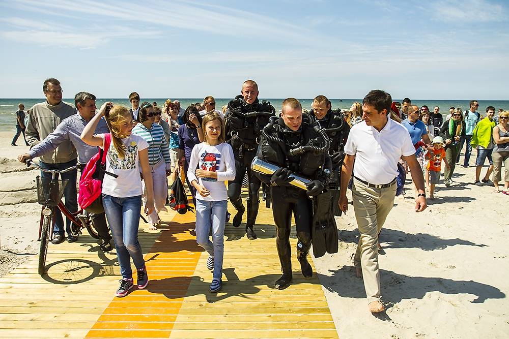 Zilo karogu no jūras iznesa Jūras spēku flotiles ūdenslīdēju komanda, kuru krastā sagaidīja pasākuma apmeklētāji un mīmi.