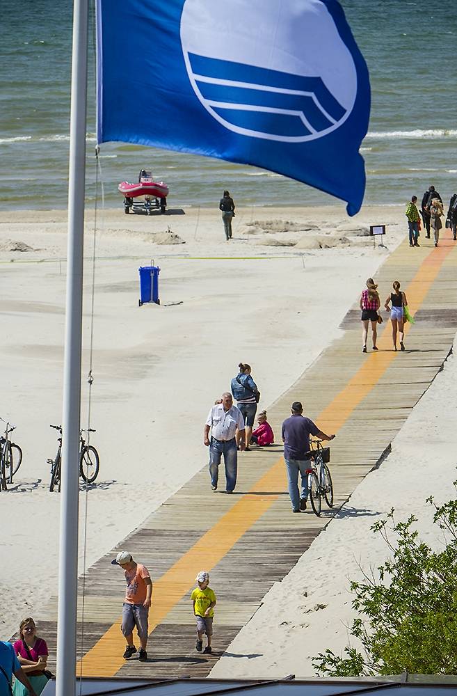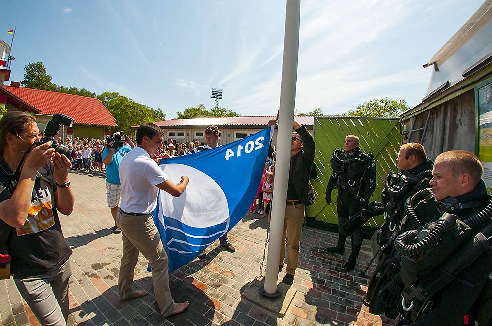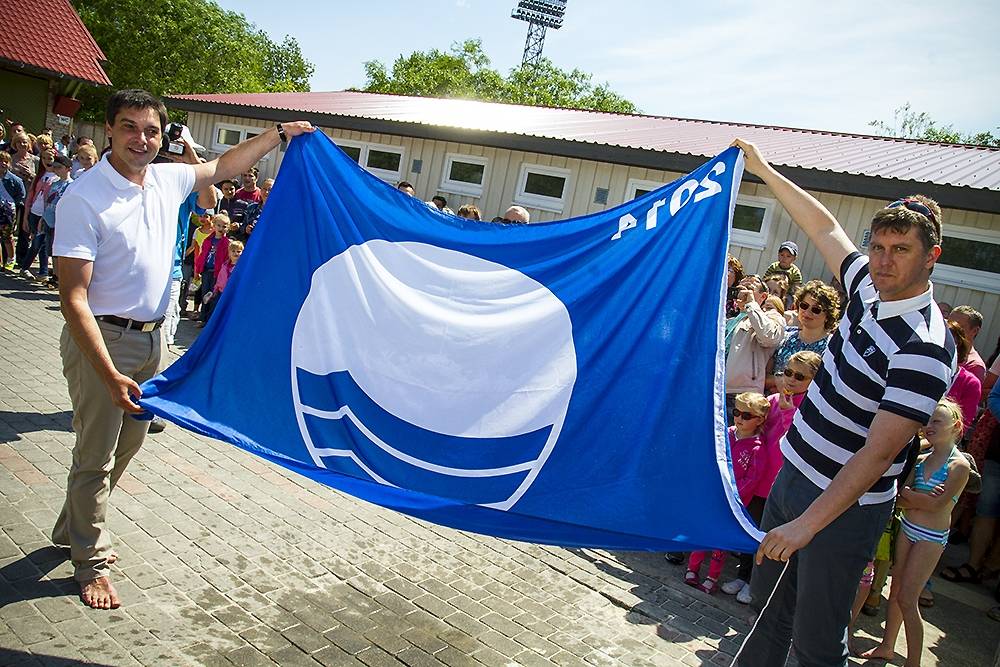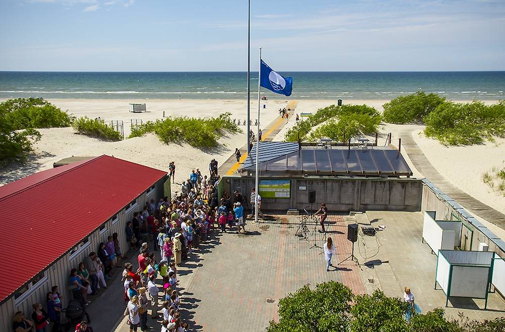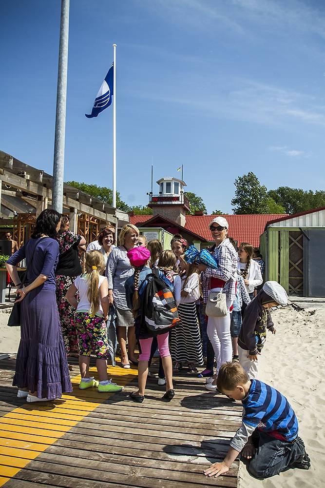FOTO: Liepājas pludmalē svinīgi paceļ Zilo karogu