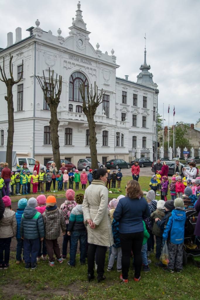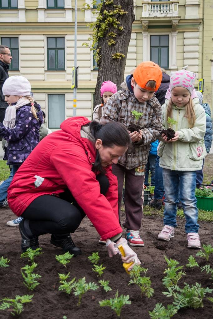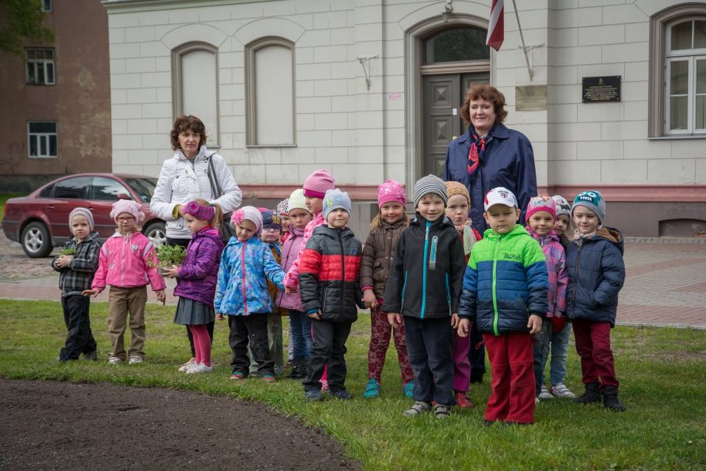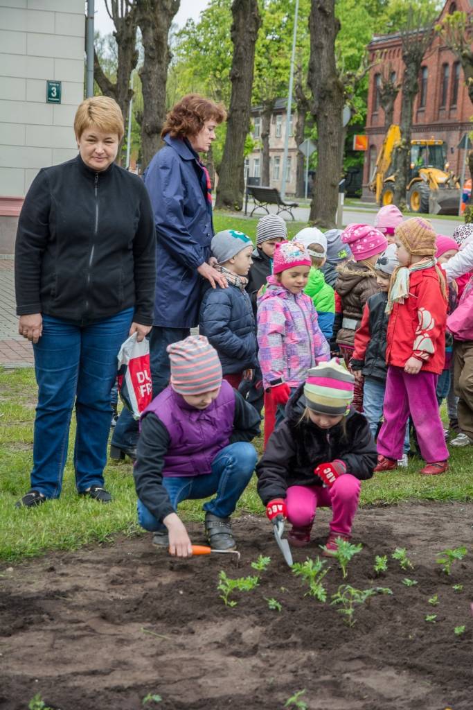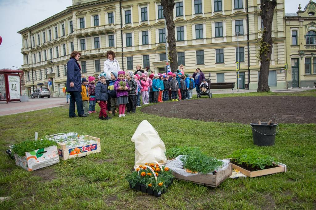 Trešdien, 20. maijā, mazie liepājnieki stādīja pašu audzētos puķu stādiņus dobē “Saules aplis” iepretim Liepājas Valsts 1. ģimnāzijai.