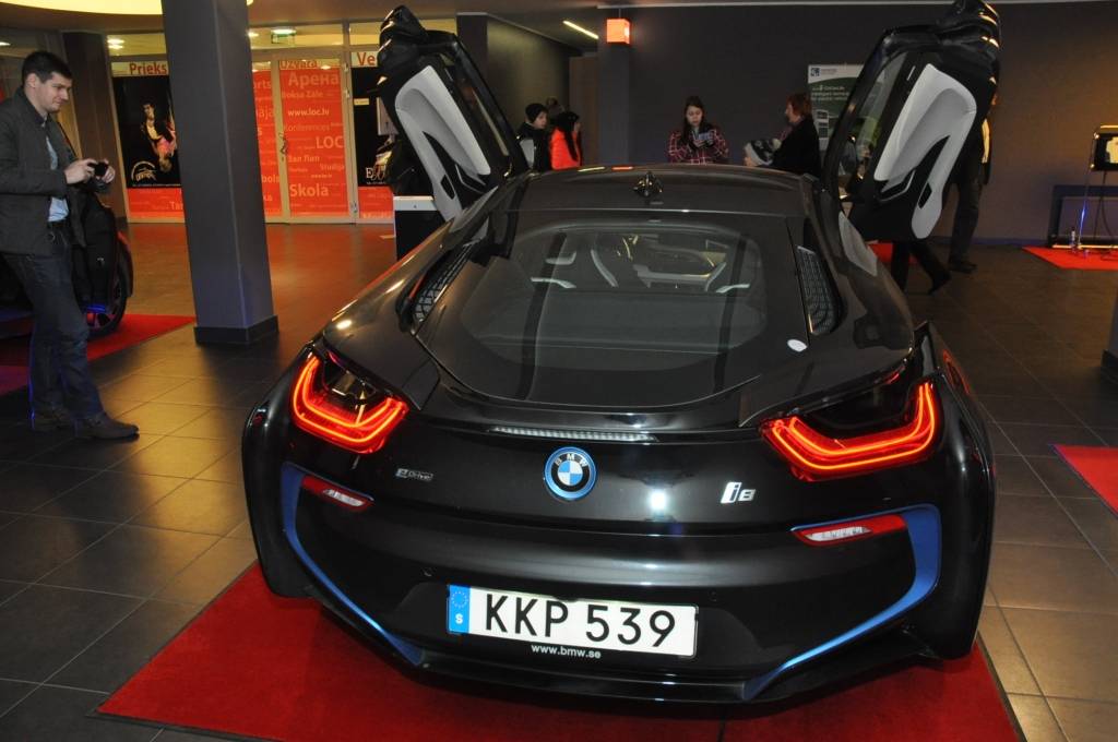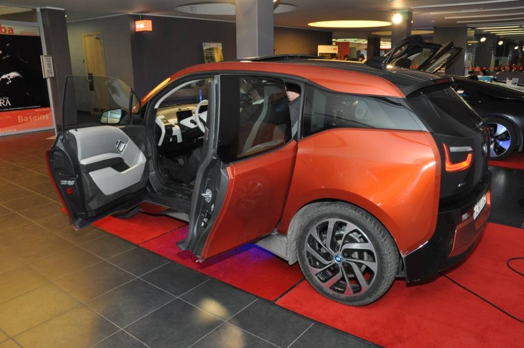 Piedāvājam foto no Liepājas Olimpiskā centra, kur otrdien apskatāmi dažādu modeļu elektromobiļi.