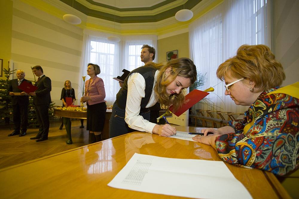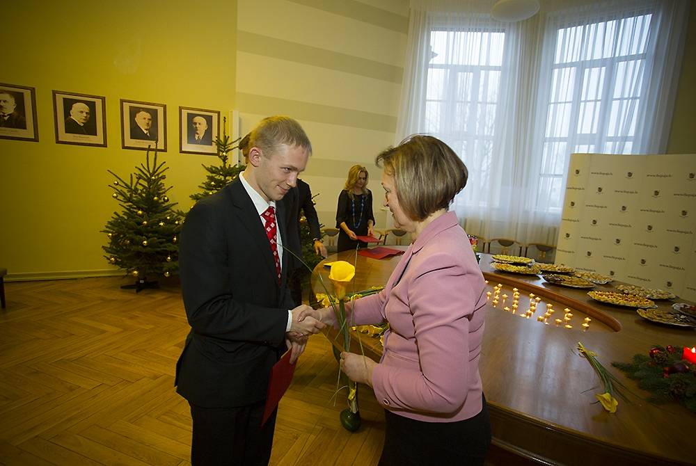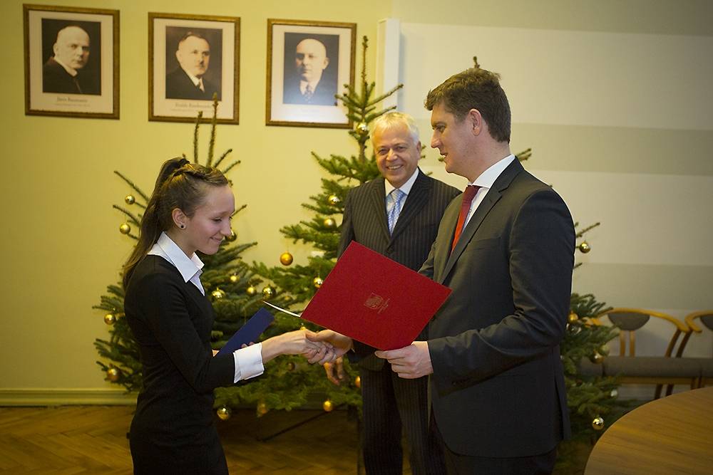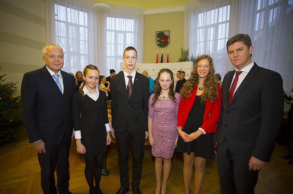 PAPILDINĀTA. Piektdien, 19. decembrī, Ziemassvētku noskaņā Liepājas Domē tradicionāli sumināja tos 36 vidusskolēnus, kuri beiguši pirmo mācību semestri ar teicamu un izcilu vērtējumu. Izcilniekus sveica Domes priekšsēdētājs Uldis Sesks, priekšsēdētāja vietnieks Vilnis Vitkovskis un Izglītības pārvaldes vadītāja Ludmila Molčanova, informē sabiedrisko attiecību speciāliste Gunta Jākobsone.