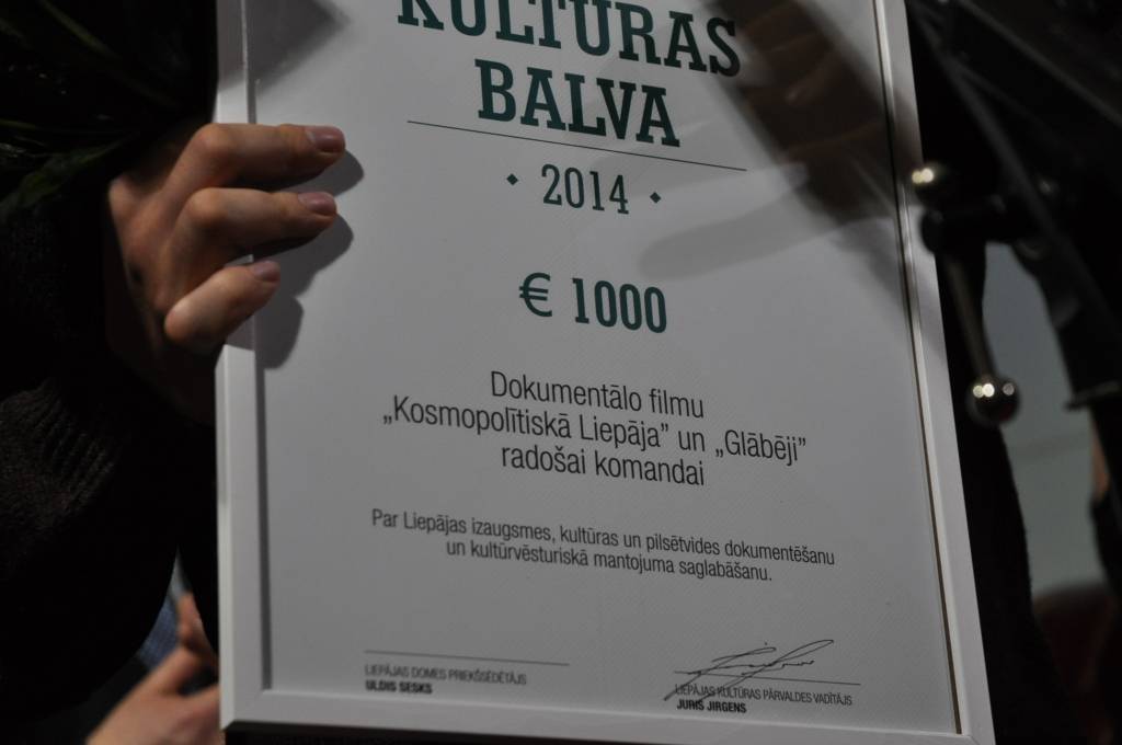 Liepājas Kultūras balvu 2014 un prēmiju 1000 eiro apmērā saņēma dokumentālās filmas “Kosmopolītiskā Liepāja” un “Glābēji” radošā komanda par Liepājas izaugsmes, kultūras un pilsētvides dokumentēšanu un kultūrvēsturiskā mantojuma saglabāšanu.