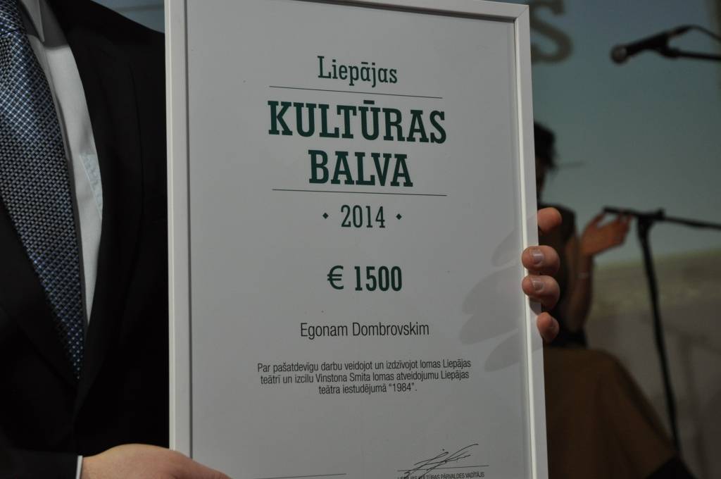 Liepājas Kultūras balvu 2014 un prēmiju 1500 eiro apmērā saņēma Liepājas teātra aktieris Egons Dombrovskis par pašatdevīgu darbu veidojot un izdzīvojot lomas Liepājas teātrī un izcilu Vinstona Smita lomas atveidojumu Liepājas teātra iestudējumā “1984”.