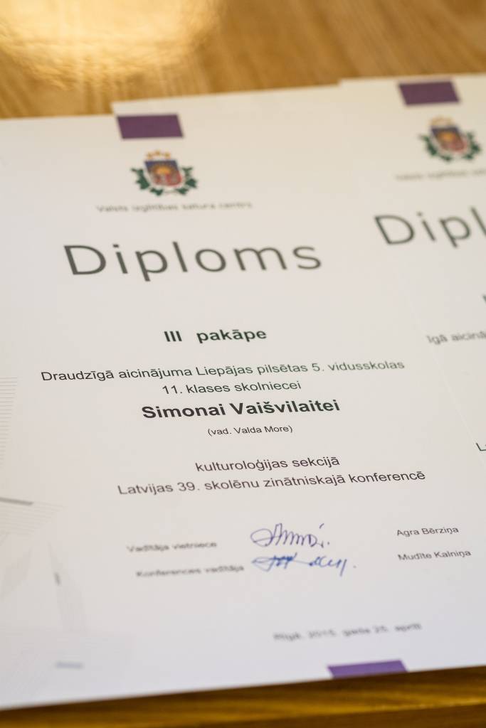 Simona Vaišvilaite (Draudzīgā aicinājuma Liepājas pilsētas 5.vidusskola – ) par 3.vietu Latvijas 39.skolēnu zinātniskajā konferencē kulturoloģijas sekcijā, skolotāja Valda More