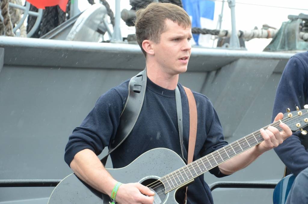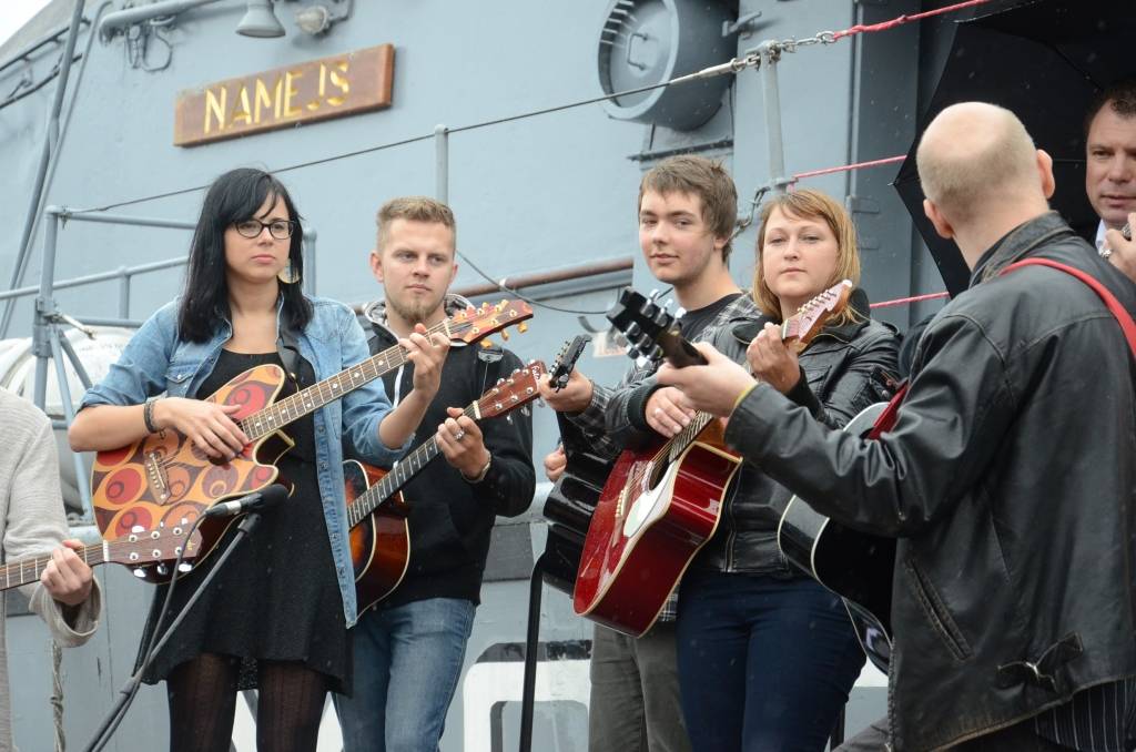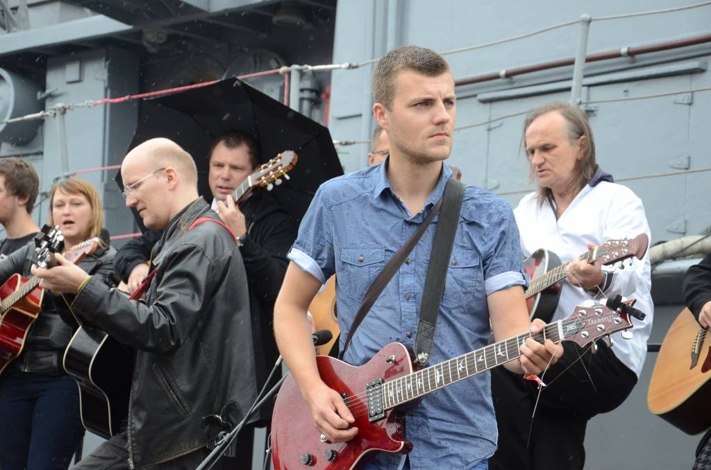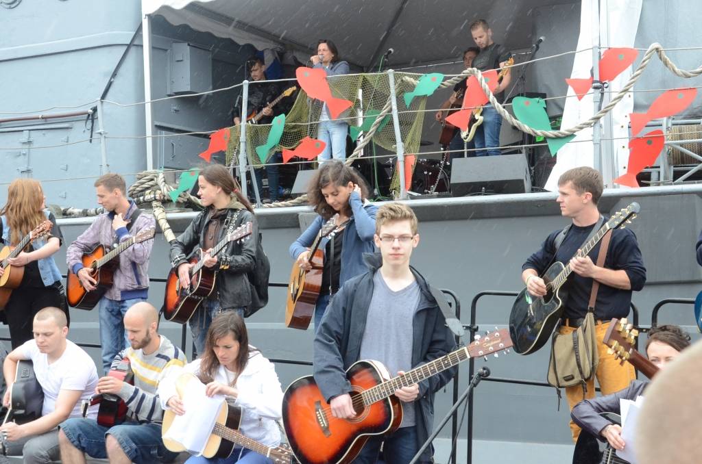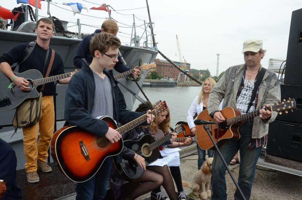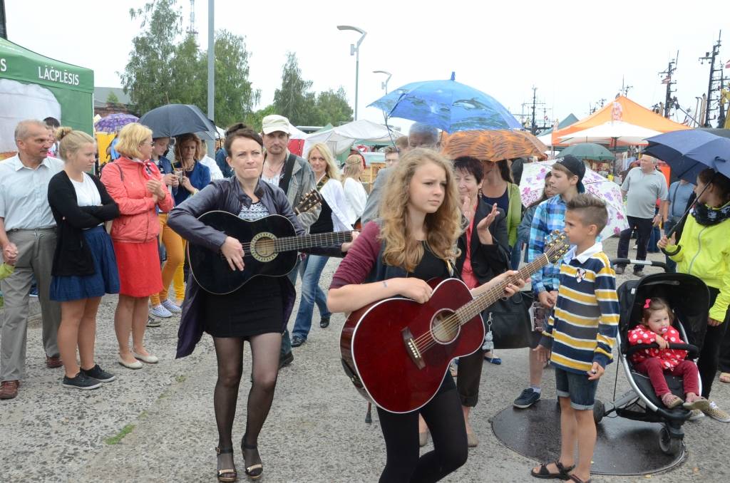 Promenādē ģitāristi saspēlējās kopā ar Liepājas mūziķi Ivo Fominu. Jūras svētku laikā visu pēcpusdienu ģitāristi muzicē uz vienas no skatuvēm.