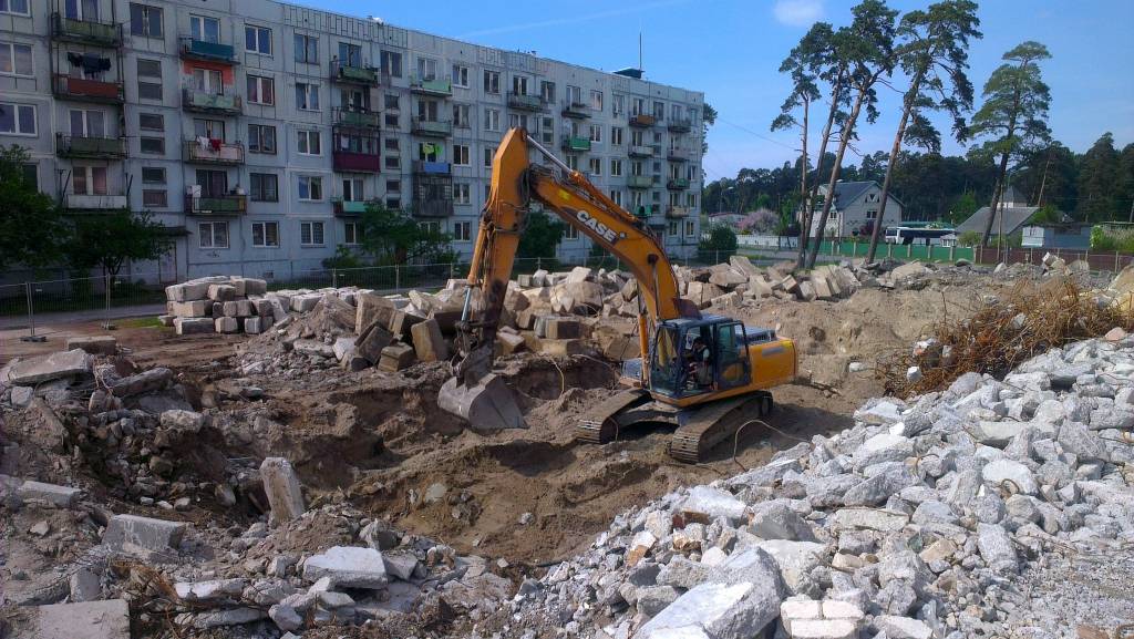 Galvenais būvuzņēmējs SIA „AD BŪVE” no Aizputes nojaucis divus, no padomju laikiem mantotos, neapdzīvotu piecstāvu dzīvojamo māju betona korpusus, demontējis to pagraba un pamatu blokus un pēdas, visus inženiertīklus, pārvietojis telekomunikāciju tīklus un rekultivējis jeb labiekārtojis teritoriju, pievedot un izlīdzinot melnzemi, iesējot zālienu.