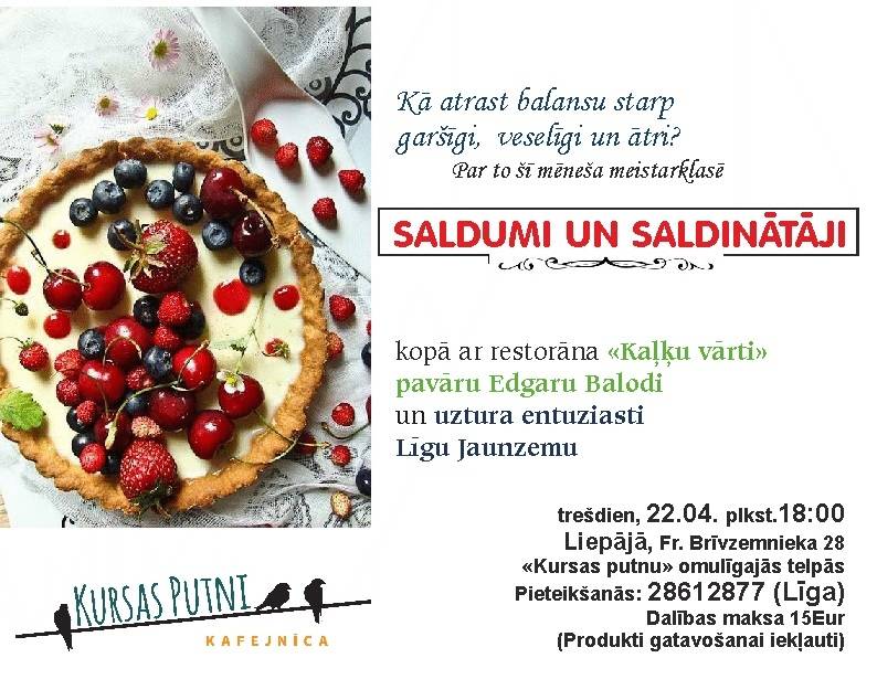 Šomēnes meistarklasē būs iespēja satikt Rīgas restorāna “Kaļķu vārti” pavāru Edgaru Balodi. Kopīgi ar dalībniekiem viņš solās radīt skaistus, veselīgus, bet vienlaikus viegli pagatavojamus desertus.