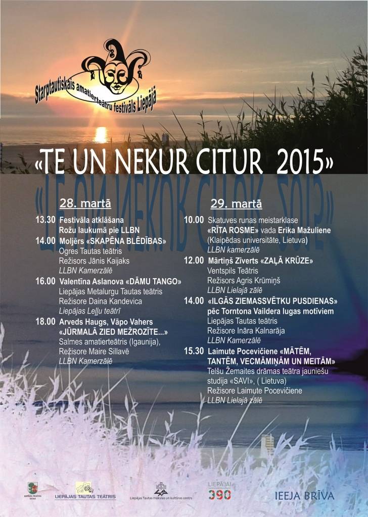 6. Starptautiskā amatierteātru festivāla “Te un nekur citur” atklāšana notiks sestdien, 28. martā, pulksten 13.30 Rožu laukumā pie Liepājas Latviešu biedrības nama. Sestdien ikvienam interesentam būs iespēja redzēt Ogres Tautas teātra, Liepājas Metalurgu Tautas teātra un Salmes amatierteātra (Igaunija) izrādes, bet svētdien Ventspils teātra, Liepājas Tautas teātra un Telšu Žemaites drāmas teātra jauniešu studijas “SAVI” (Lietuva) izrādes.