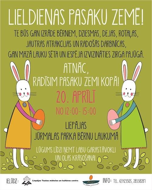 Svētdien, 20.aprīlī, no pulksten 12.00 līdz 15.00 Liepājas Jūrmalas parka Bērnu laukumā kopā ar Ceļojošo Leļļu teātri “Maska”, Lieldienu Zaķi, bērnu deju kolektīvu “Krustiņi”, vidējās paaudzes deju kolektīvu “Vaduguns” un senioru deju kolektīvu “Sidrabvilnis”, bērnu vokālo studiju “Pērlītes”, folkloras kopu “Vēlava”, tautas lietišķās mākslas studiju “Kursa”, ziedu dizaina studiju “Liepava”, kā arī Bērnu un jaunatnes centra struktūrvienību “Laumiņa” un radošo apvienību “Krāsu karuselis” notiks svētku sarīkojums “Lieldienas pasaku zemē”, ziņo Liepājas Tautas mākslas un kultūras centra projektu vadītāja Aija Eizengrauda.