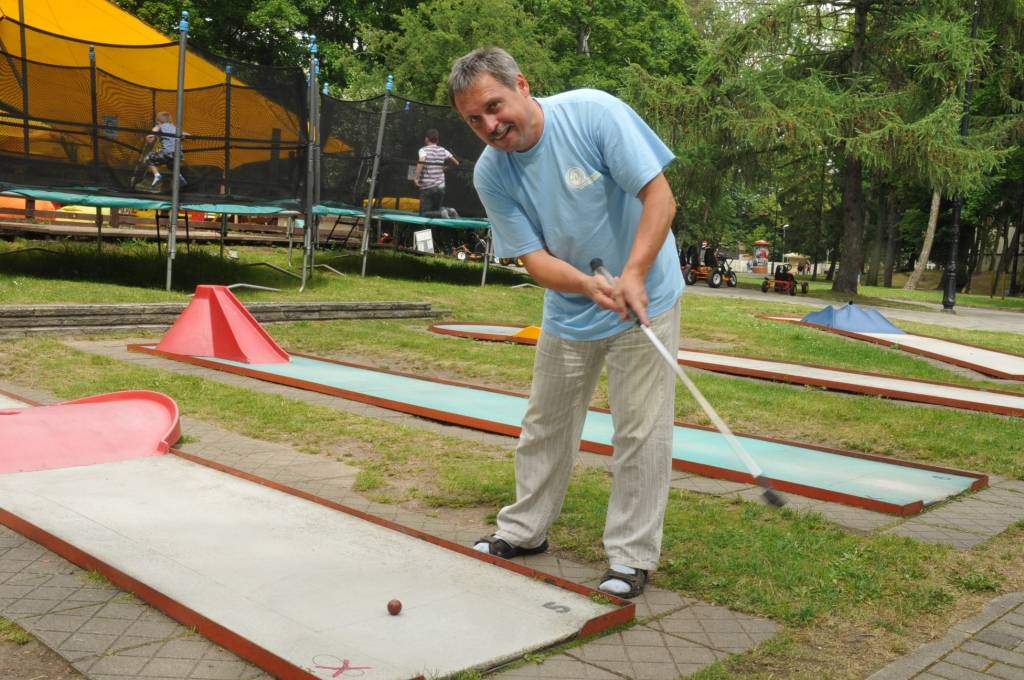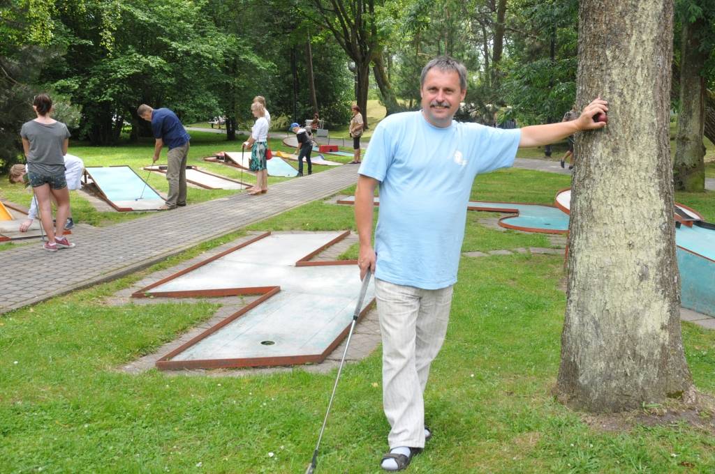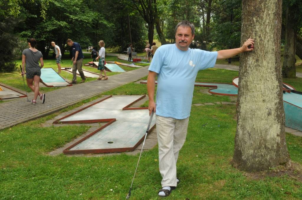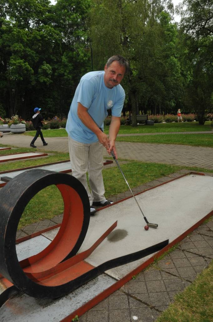 Patiesībā izrādās, ka Liepājā ir pat divi laukumu kompleksi, kur spēlēt minigolfu. Īpašnieks stāsta: “Mums ir āra laukumi Jūrmalas parkā, kuriem šogad apritēs 20 gadi. Tos mēs visu laiku cenšamies uzlabot un sakārtot. Un tad ar biedrību “Līva” nopirkām lietotus laukumus, ko paši arī salabojām, un novietojām Liepājas Olimpiskajā centrā. Ar lepnumu varu teikt, ka tie ir labākie minigolfa laukumi Latvijā, jo katru gadu martā rīkojam starptautisku turnīru “Liepāja Open”, un, ja ārzemju spēlētāji šajos laukumos var uzsist 18 punktus (šajā spēlē mazāk punktu ir labāk), tad zinu, ka laukumi ir ļoti labi!”.