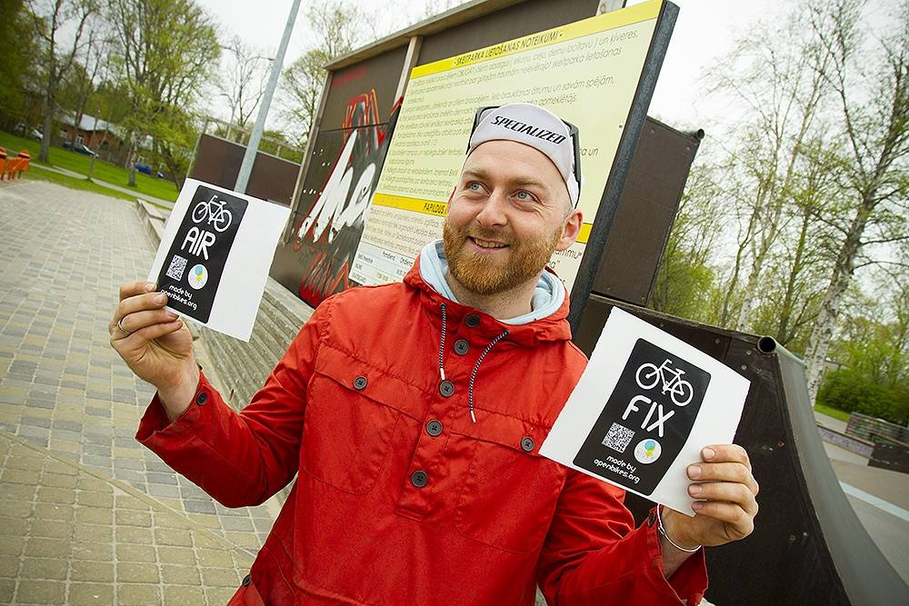 Statīvi velosipēdu labošanai un riepu piepumpēšanai uzstādīti pilotprojekta ietvaros; autors ir „OpenBikes” jeb nodibinājums „Rīgas atvērtā velo darbnīca”.
