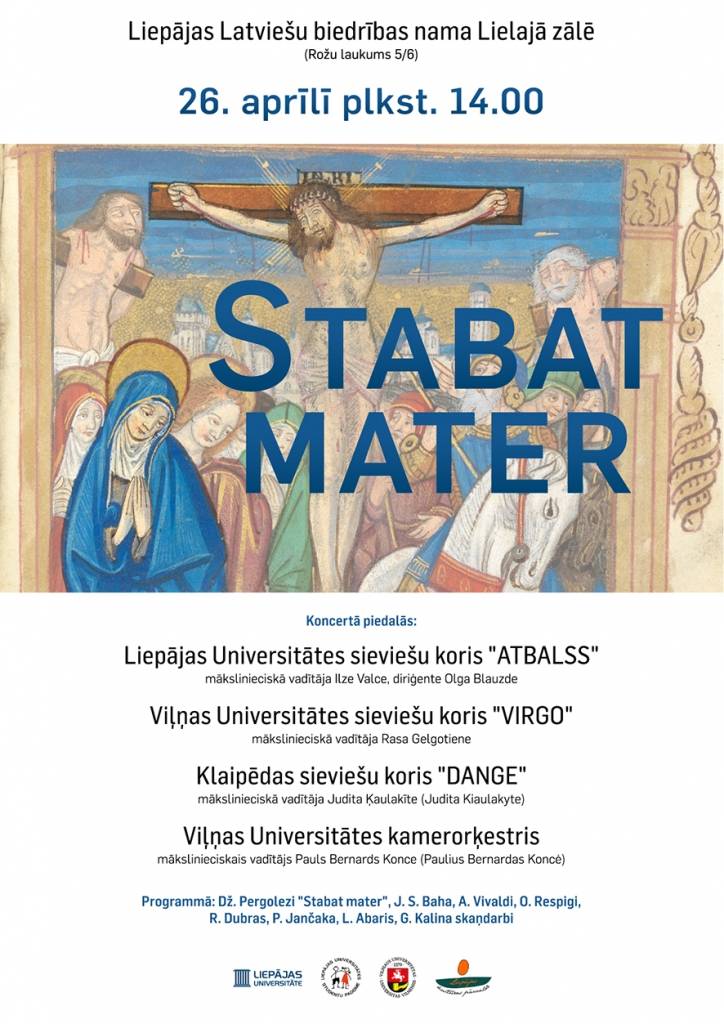 26. aprīlī plkst. 14.00 Liepājas Latviešu biedrības nama Lielajā zālē notiks Liepājas Universitātes sieviešu kora “Atbalss” (mākslinieciskā vadītāja Ilze Valce), Klaipēdas sieviešu kora “Dange” (mākslinieciskā vadītāja Judita Ķaulakīte (Judita Kiaulakyte), Viļņas Universitātes sieviešu kora “Virgo” (mākslinieciskā vadītāja Rasa Gelgotiene) un kamerorķestra (mākslinieciskais vadītājs Pauls Bernards Konce) sadraudzības koncerts „Stabat mater”.