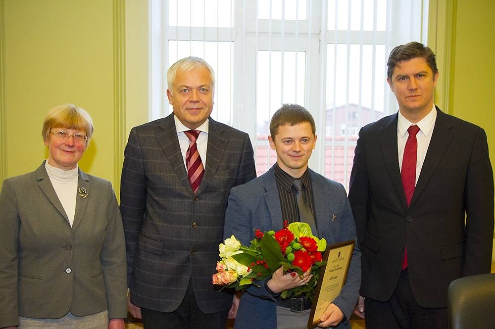 Piektdien, 5. decembrī, svinīgā pasākumā Liepājas domes priekšsēdētājs Uldis Sesks un priekšsēdētāja vietnieks Vilnis Vitkovskis Liepājas pilsētas Gada balvu zinātnē pasniedza asociētajai profesorei Diānai Laiveniecei, filoloģijas doktoram Normundam Dzintaram un maģistram Valdim Priedolam.