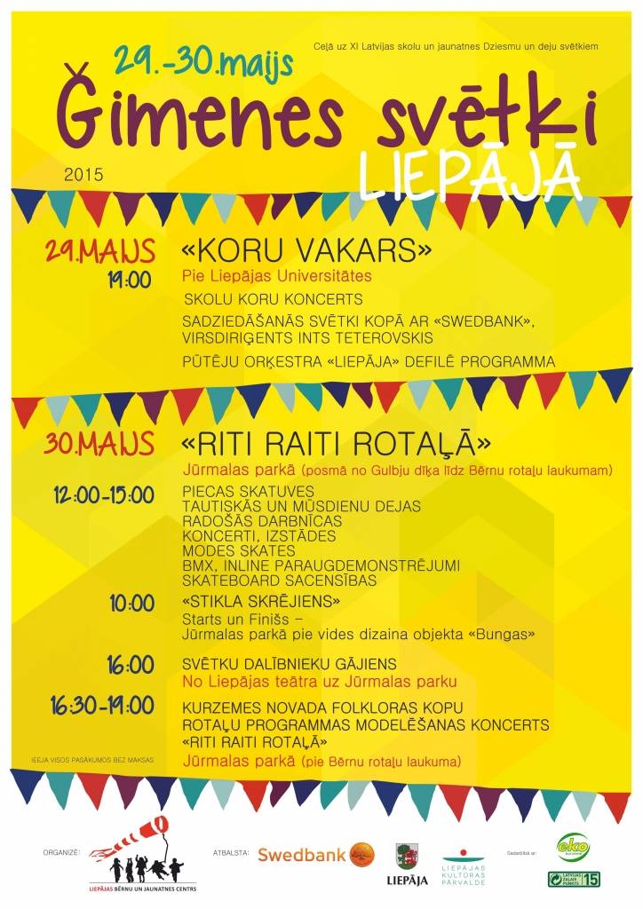 29. un 30. maijā notiks “Ģimenes svētki Liepājā”, kurus tradicionāli rīko Liepājas Bērnu un jaunatnes centrs. Svētki būs gan skaists noslēgums mācību gadam, gan ieskaņas pasākums XI Latvijas skolu jaunatnes dziesmu un deju svētkiem, informē Liepājas pilsētas Izglītības pārvaldes sabiedrisko attiecību speciāliste Gunta Jākobsone.