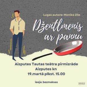 Sestdien, 19. martā, pulksten 15 Aizputes kultūras namā Aizputes Tautas teātris spēlēs pirmizrādi – Monikas Zīles lugu “Džentelmenis ar pannu.