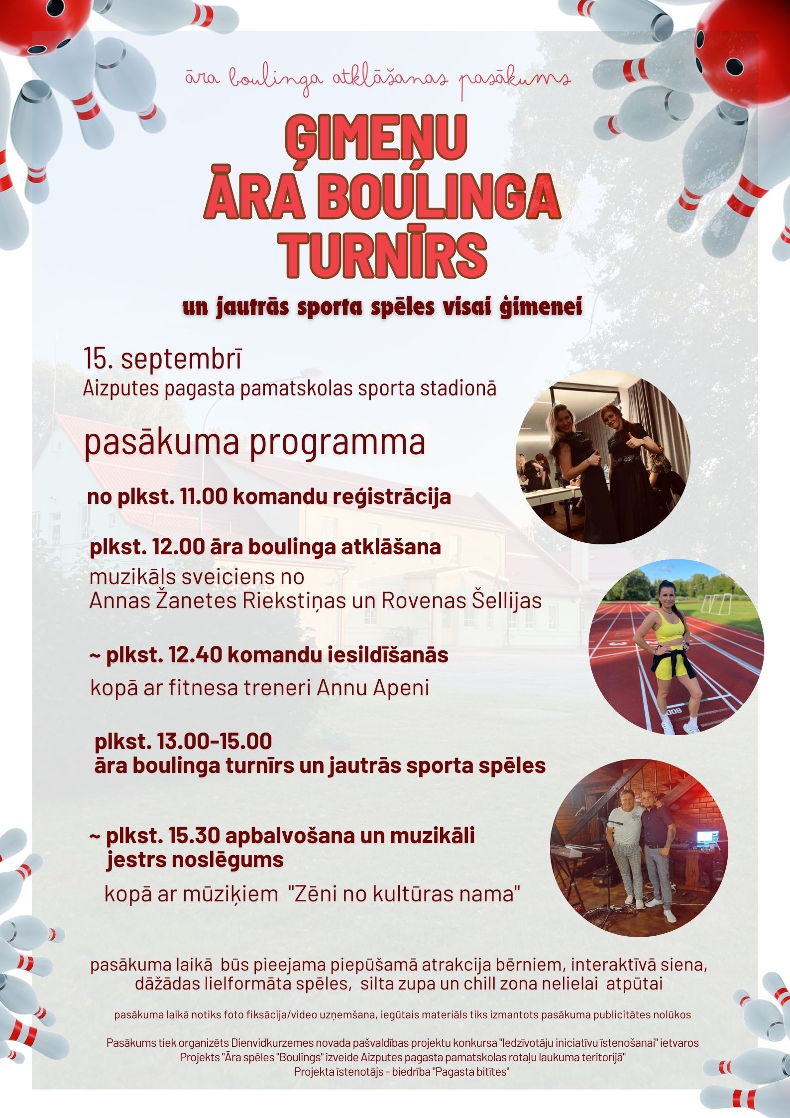 Svētdien, 15. septembrī, Aizputes pagasta pamatskolas sporta stadionā tiks atklāts āra boulings un tā ietvaros norisināsies Ģimeņu āra boulinga turnīrs un jautrās sporta spēles visai ģimenei.