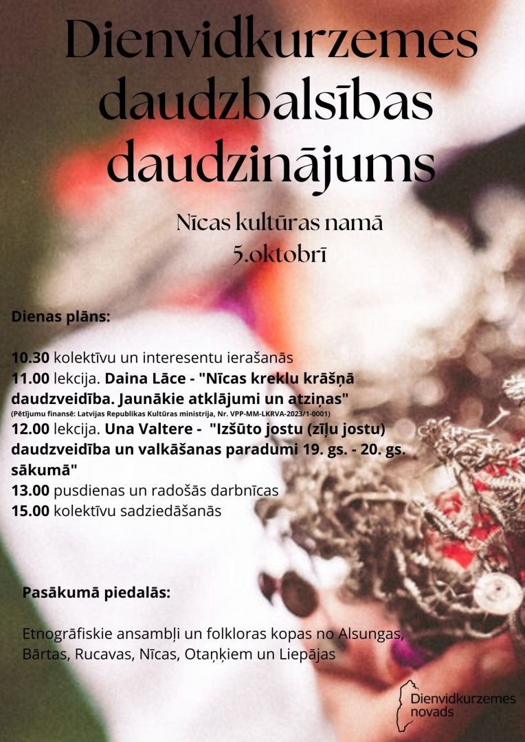 5. oktobrī no pulksten 11 Nīcas kultūras namā norisināsies “Dienvidkurzemes daudzbalsības daudzinājums”, kopā pulcējot novada un Liepājas etnogrāfiskos ansambļus un folkloras kopas, kā arī pasākumu papildinās izzinošas lekcijas.