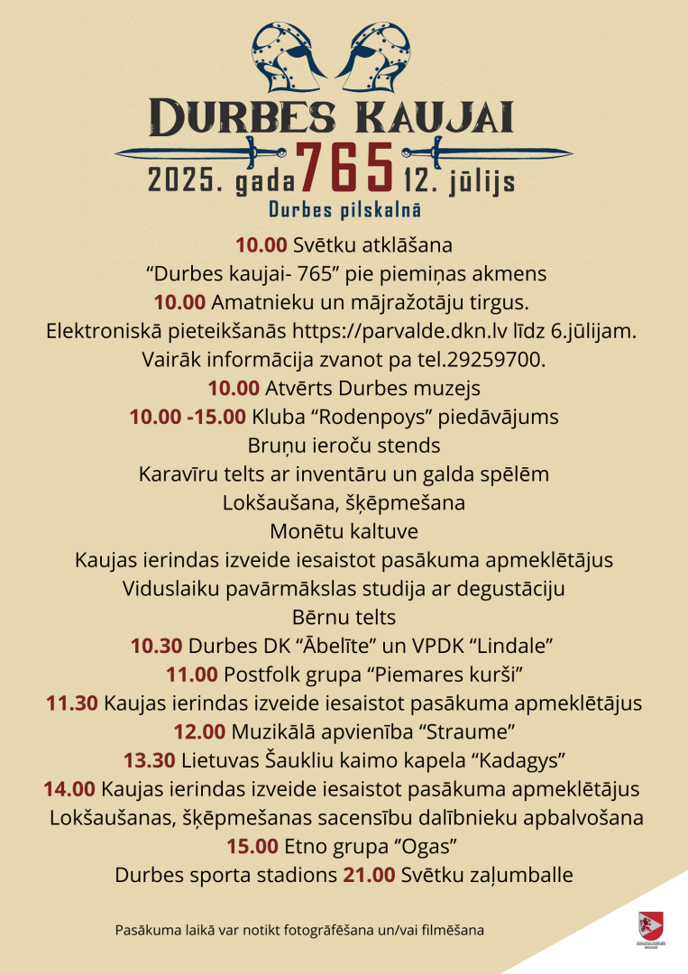 Sestdien, 12. jūlijā, no pulksten 10 Durbes pilskalnā svētkus atzīmēs vēsturnieku vērtējumā vienai no spilgtākajām 13. gs. kaujām Baltijā – Durbes kaujai, kurai šogad aprit 765 gadadiena. 1260. gada 13. jūlijā Durbes senlejā norisinājās kauja, kurā žemaišu un kuršu karaspēks pieveica vācu Livonijas ordeņa apvienoto karaspēku.
