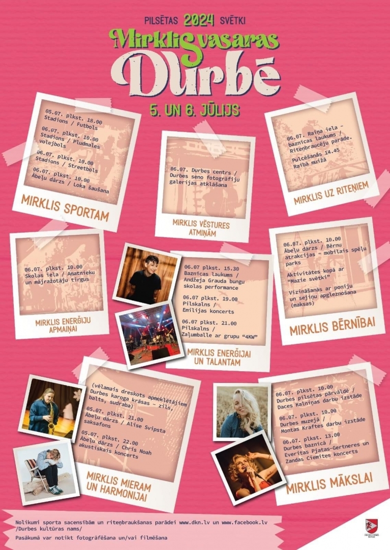 6. jūlijā uz svētkiem aicina Latvijas mazākā pilsētas Durbe, svinot pilsētas svētkus “Mirklis vasaras Durbē”.