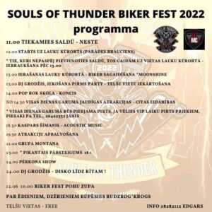 Liepājas klubs “Souls of Thunder” sestdien, 11. jūnijā, Kazdangas atpūtas vietā “Lauku kūrorts” jaudīgi rīkos savu pirmo festivālu “Souls of Thunder Biker Fest 2022”. Festivāla sākums pulksten 13.