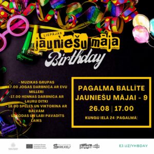 Piektdien, 26. augustā, pulksten 17 Liepājas Bērnu un jaunatnes centra struktūrvienībā “Jauniešu māja”, Kungu ielā 24, notiks svētki “Jauniešu mājas devītā dzimšanas diena”, kuru laikā jauniešiem būs iespēja apgūt hennas gatavošanu, piedalīties jogas nodarbībās, demonstrēt savu muzikālo talantu brīvajā mikrafonā un spēlēt dažādas izklaidējošas un jautras spēles.