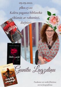 9. septembrī pulksten 17 Kalētu pagasta filiālbibliotēkā Dzejas dienu laikā tikšanās ar rakstnieci un dzejoļu autori Gunitu Lagzdiņu.