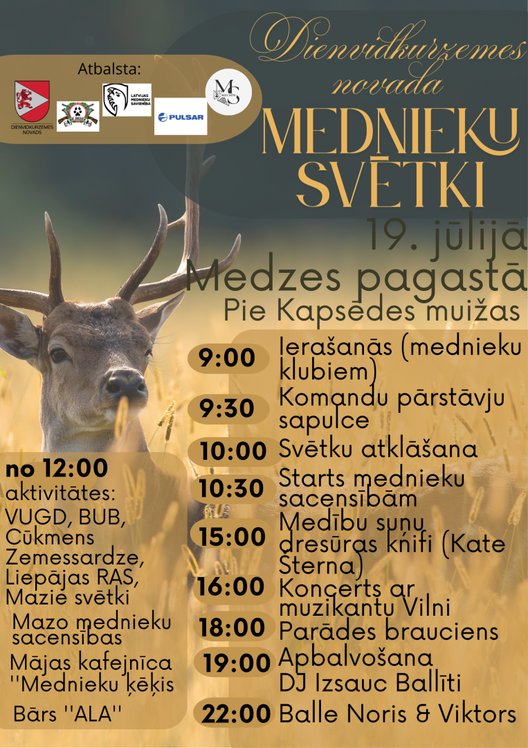 Atzīmējot mednieku kluba “Medze” simtgadi, 19. jūlijā no pulksten 9 Medzes pagastā norisināsies vērienīgi svētki, aizsākot jaunu tradīciju – Dienvidkurzemes novada mednieku svētkus. Pasākums pulcēs medniekus un interesentus no visa novada, lai godinātu medību kultūru, stiprinātu kopienu un veicinātu savstarpēju sadarbību.