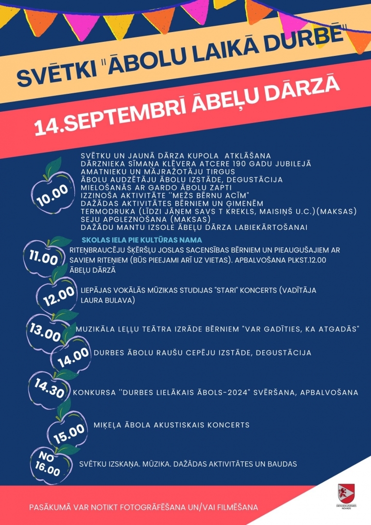 Sestdien, 14. septembrī, no pulksten 10 jau 12. reizi Durbes dārznieka Sīmaņa Klēvera ābeļu dārzā un Skolas ielā ikviens aicināts svinēt rudeni un ābolu ražas laiku pasākumā “Ābolu laiks Durbē”. Šī gada pasākuma īpašais notikums – jaunā ābeļu dārza kupola atklāšana par godu dārznieka Sīmaņa Klēvera 190 gadu atceres jubilejai.