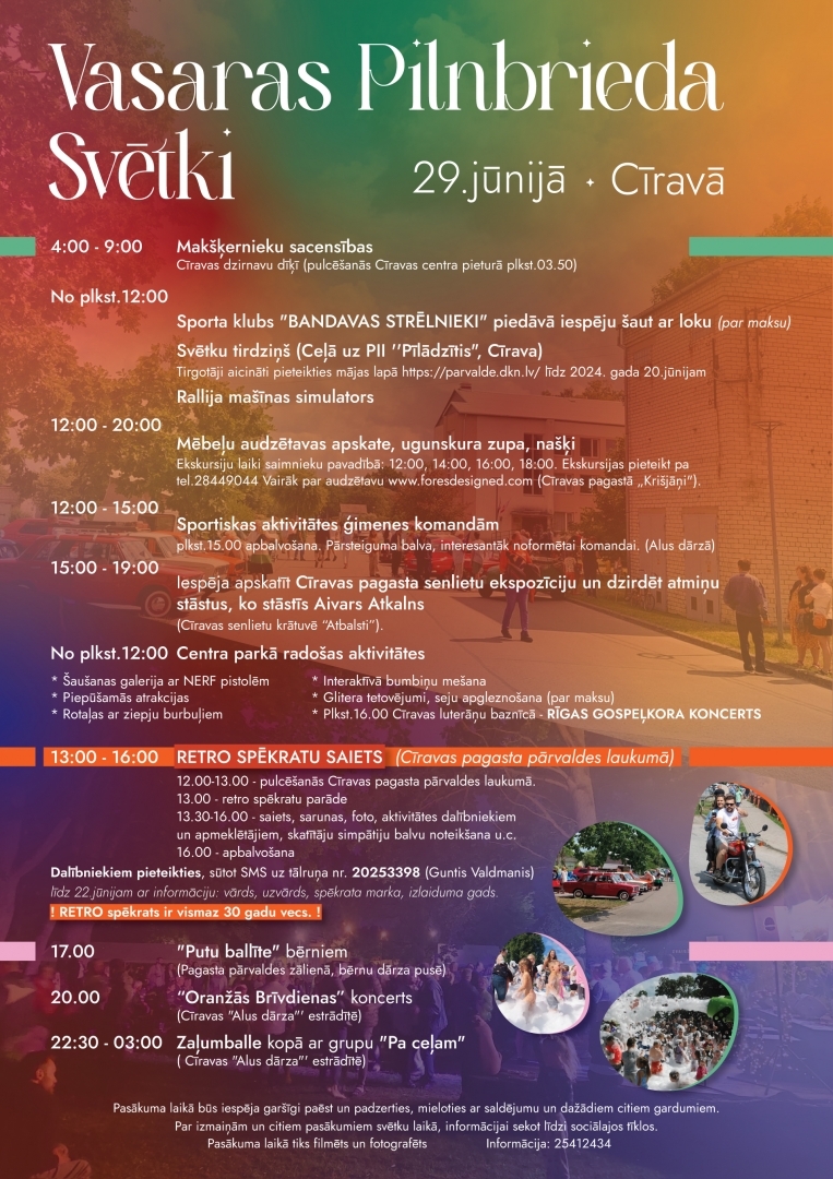 29. jūnijā Cīravā visas dienas garumā notiks “Vasaras pilnbrieda svētki”. No pulksten 13.00 Cīravas pagasta pārvaldes laukumā “Retro spēkratu saiets”, kas apmeklētājus priecēs ar spēkratu parādi, sarunām, fotografēšanos, gan skatītāju simpātijas laureāta noskaidrošana. Saietā aicināti piedalīties spēkratu īpašnieki, kuru īpašumā ir vismaz 30 gadus vecs eksponāts.