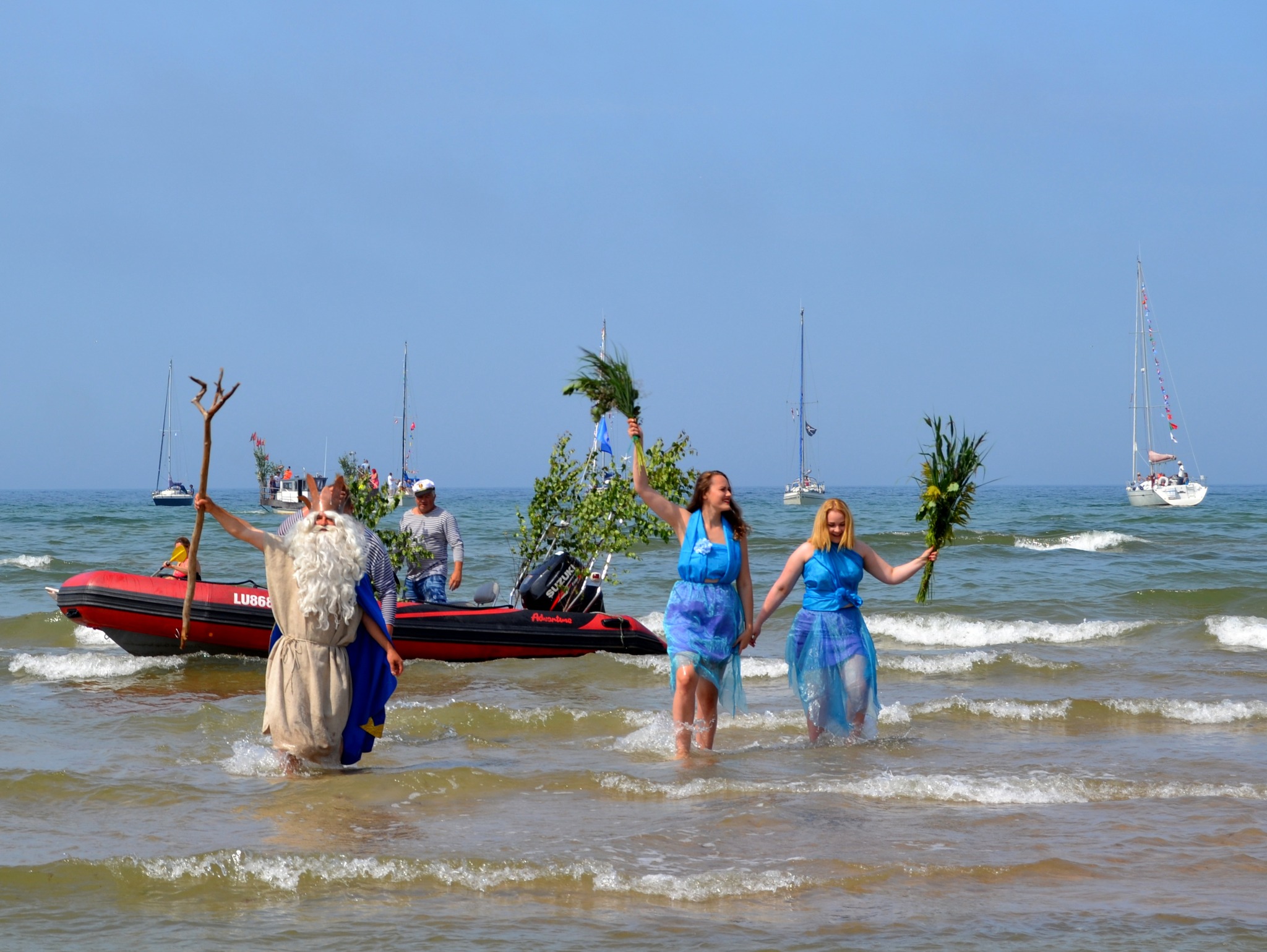 Ostā pulksten 14 svētku noskaņu radīs aktieri Veronika Plotņikova un ŅIkita Osipovs, kā arī trio “Ar Maestro”. Pulksten 15 būs kuģu un laivu parāde jūrā, sasveicināšanās ar jūras valdnieku. No pulksten 16 grupa “Bezvējš”, Fēlikss Ķiģelis ar grupu.