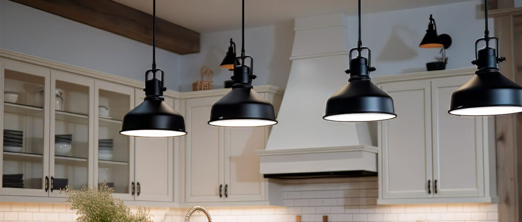 Virtuves dizainam lieliski piemēroti piekaramie izstrādājumi ar plafoniem no metāla vai keramikas. Tie ir ērti lietojami, viegli tīrāmi. Tie lieliski izskatās virs bāra letes, atdalot virtuves salas telpu no pārējās telpas. Vada garums ir atkarīgs no griestu augstuma un virsmas lieluma, virs kuras atradīsies lampa.