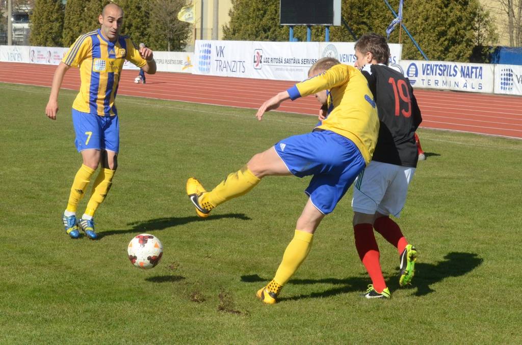 PAPILDINĀTS AR BILDĒM. Uzvaru Latvijas “SMScredit.lv Virslīgas” futbola čempionāta Kurzemes derbijā sestdien dramatiskā cīņā guva čempione “Ventspils”, kas ar rezultātu 3:2 (1:1) savā laukumā pieveica jaundibināto klubu “Liepāja”.