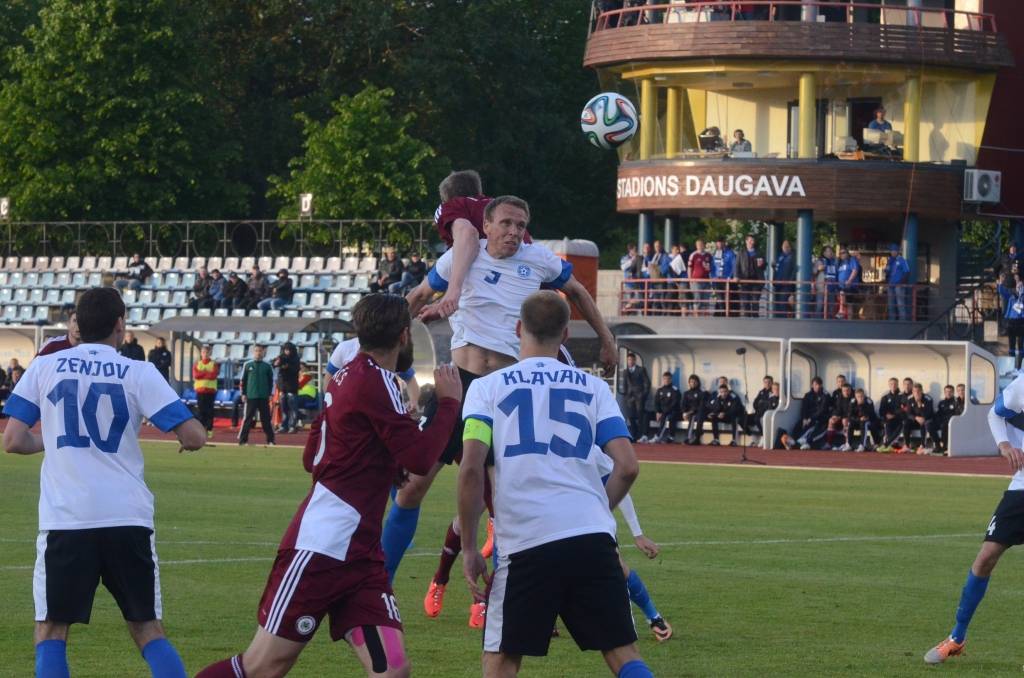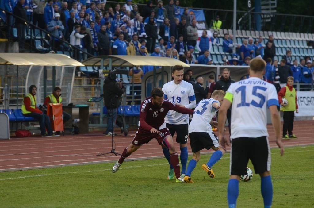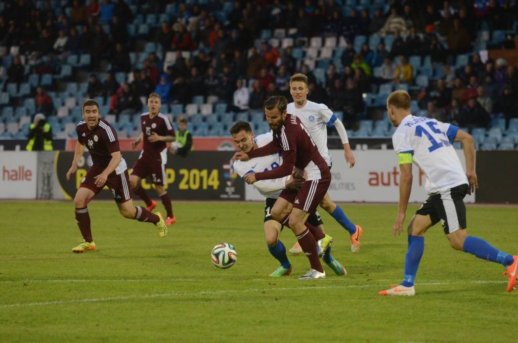 Spēles ievadā neviena no komandām netika pie vērā ņemamām iespējām izcelties, agresīvā cīņā spēkojoties par teritoriālo pārsvaru. Nedaudz labāk bumbu pieturēja Igaunijas izlase, tomēr pie bīstamiem sitieniem tā netika. Spēles 12.minūtē Verpakovska vietā laukumā devās Edgars Gauračs, tomēr ar vienu izteiktu uzbrucēju spēlējošā Latvijas izlase līdz pretinieku vārtiem tika reti. Puslaika vidū pirmo bīstamo sitienu pa vārtiem izdarīja Andrejs Kovaļovs, tomēr tas nebija precīzs. Vēlāk pēc stūra sitiena garām vārtiem sita Nauris Bulvītis, bet no izcilas pozīcijas vārtu rāmī netrāpīja Gauračs. Pēdējās puslaika minūtēs Gauračs atkal varēja izcelties, tomēr viesus glāba vārtsargs Sergejs Pareiko.