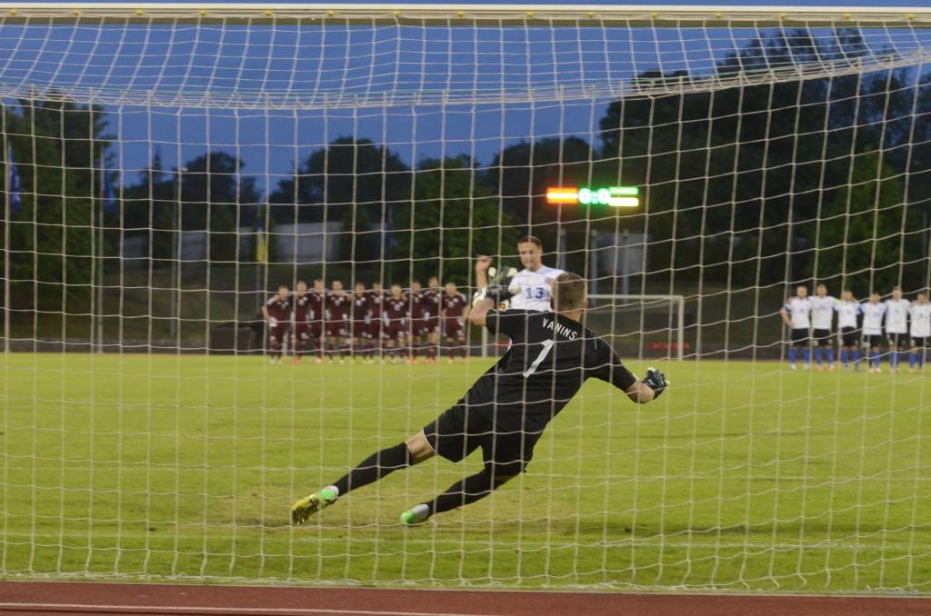 Pēcspēles sitienu sērijā Vaņins atvairīja Igaunijas komandas otro raidījumu, bet viesu ceturtajā sitienā bumba atsitās pret vārtu stabu. Uzvaru ar precīzu ceturto sitienu Latvijai atnesa Višņakovs.