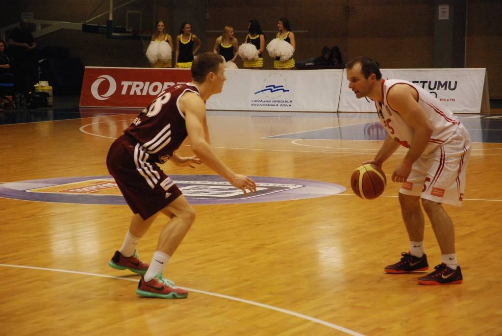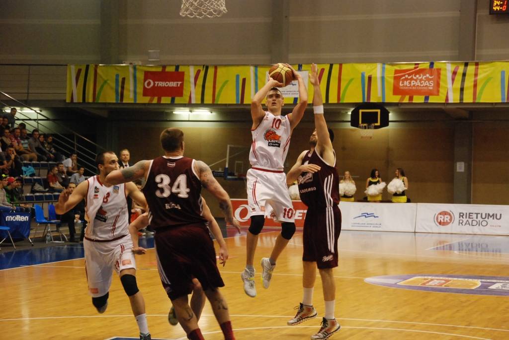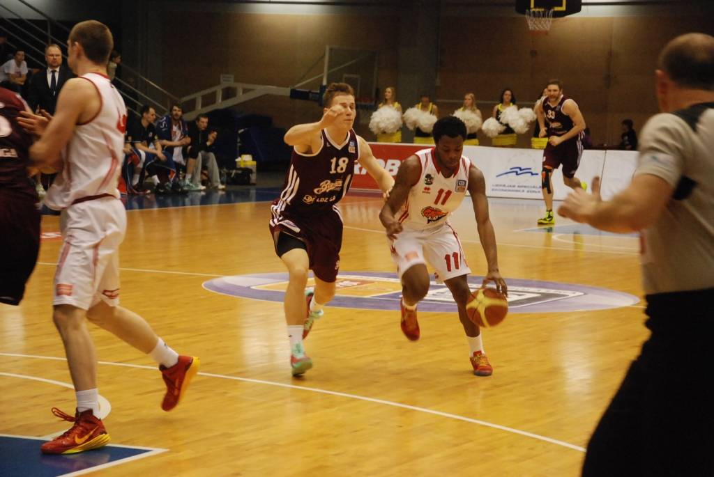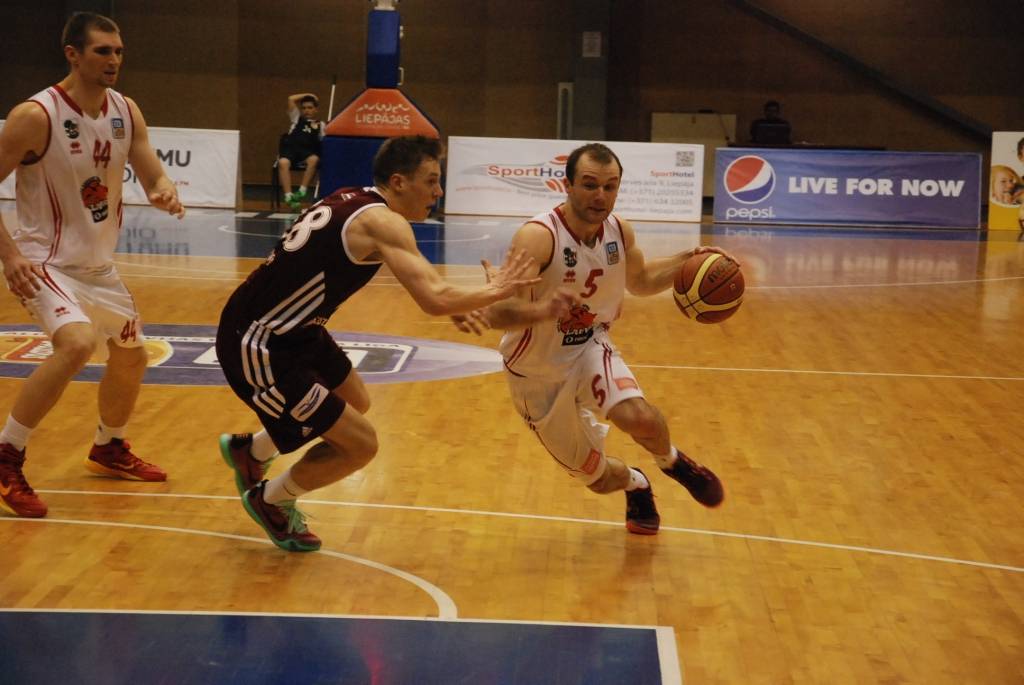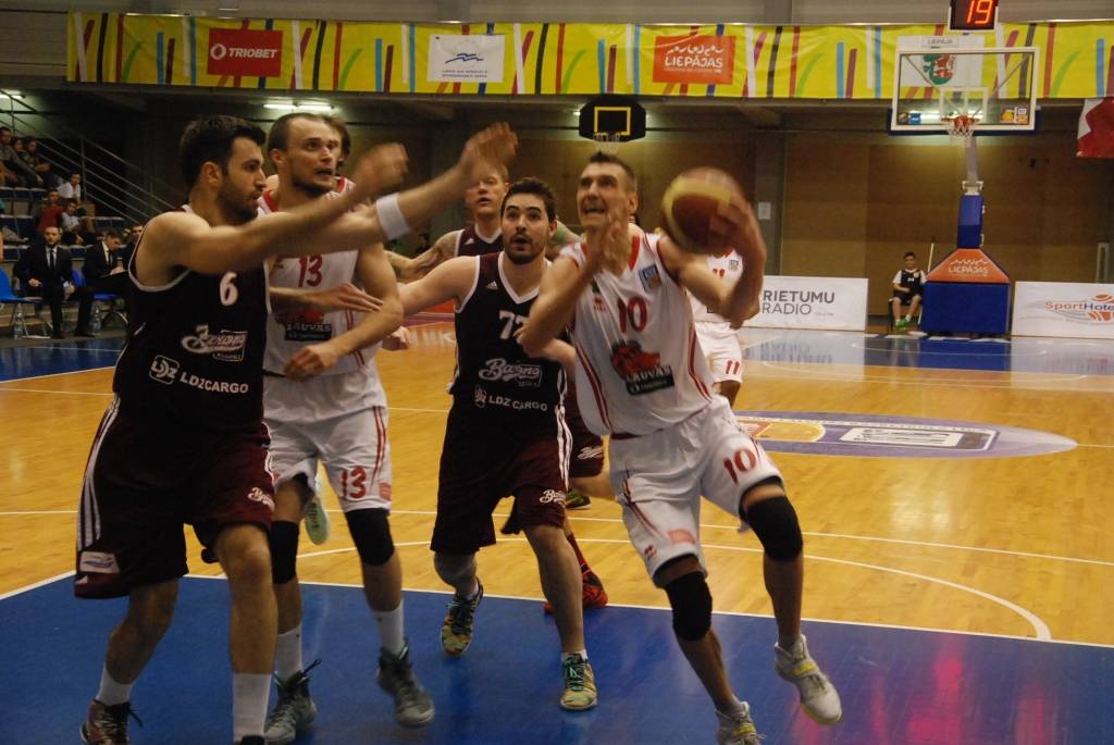 “Liepājas/Triobet” basketbolisti trešdien, 15. aprīlī, Liepājas Olimpiskajā centrā “Aldaris” Latvijas Basketbola līgas pirmās divīzijas ceturtdaļfināla pirmajā spēlē ar 65:47 (16:14; 15:11; 19:11; 15:11) uzvarēja komandu “Barons/LDz”.